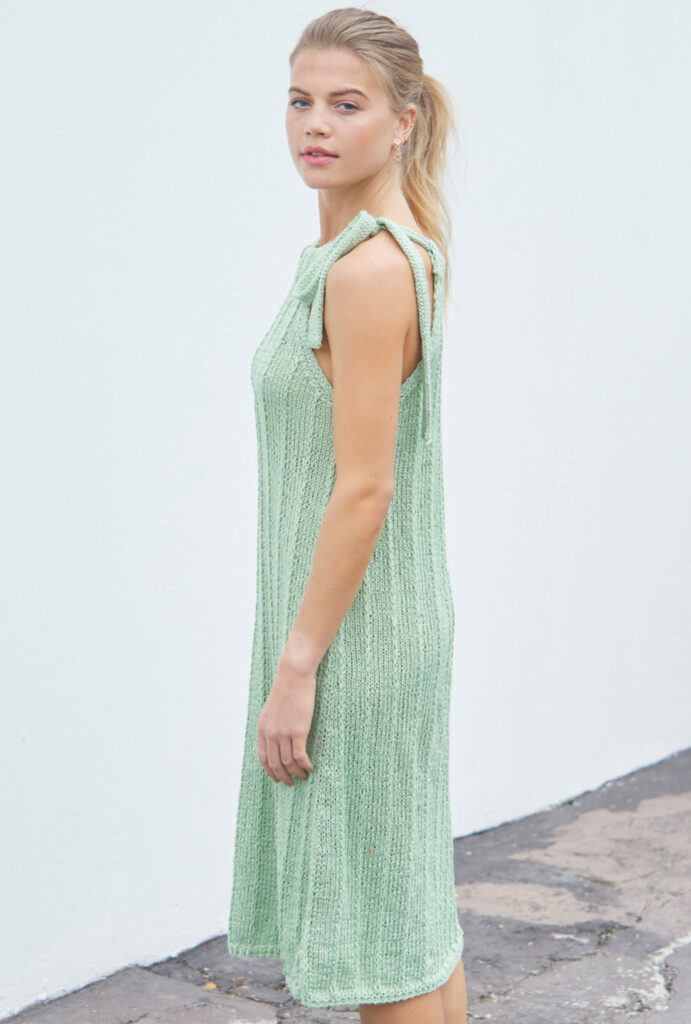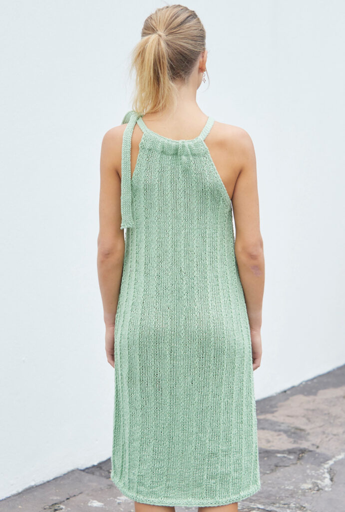 Bei diesem ärmellosen, luftigen Kleid wird dank der leichten A-Linie und der frechen Binde-Schleife auf einer Schulter die obere Körperpartie betont. Das Stricken geht recht flott, wechseln sich doch einfach nur glatt rechte Maschen mit einem Streifen aus Hebemaschen ab. Der Schnitt in A-Linienform ist besonders figurfreundlich und umspielt die Hüften. Ein gestricktes Band wird zum Schluss durch den Tunnel am oberen Ende von Vorder- und Rückenteil gezogen und auf einer Schulter zur Schleife verknotet. Wem das zu romantisch erscheint, macht das Strickband kürzer und verbindet die Enden im Maschenstich. Eine Anleitung kann in den Größen 34/36 und 38/40 sowie 42/44 downgeloadet werden.