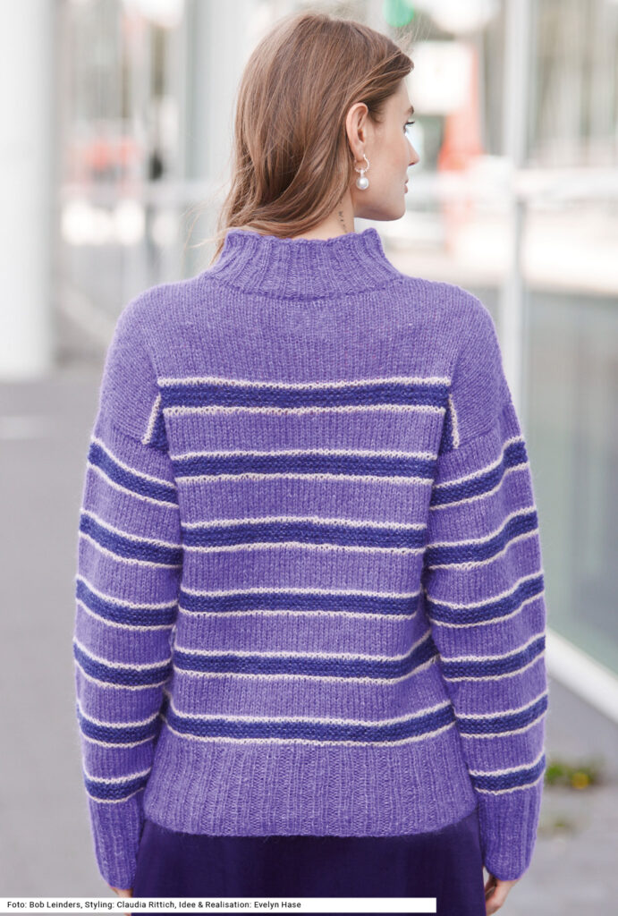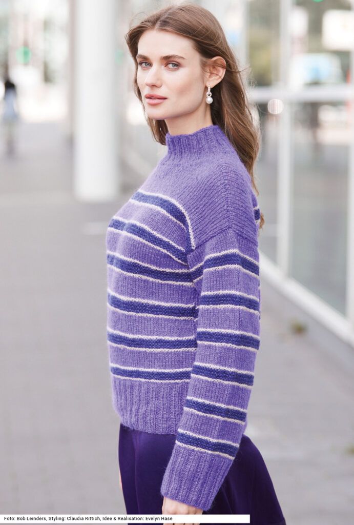 Dieser Streifenpulli ist ein absoluter Klassiker und Allrounder – dazu noch ein Modell, das auch für Strickanfänger geeignet ist! Die Bündchen sind im Rippenmuster gearbeitet, im Hauptteil wechseln sich kraus rechts und glatt rechts gestrickte Streifen ab. Dennoch ist das Modell ein echter Hingucker, denn das Garn sorgt für eine edle, sanft fließende Silhouette und die Farben sind perfekt aufeinander abgestimmt, bieten genau das richtige Maß an Kontrast und Harmonie.