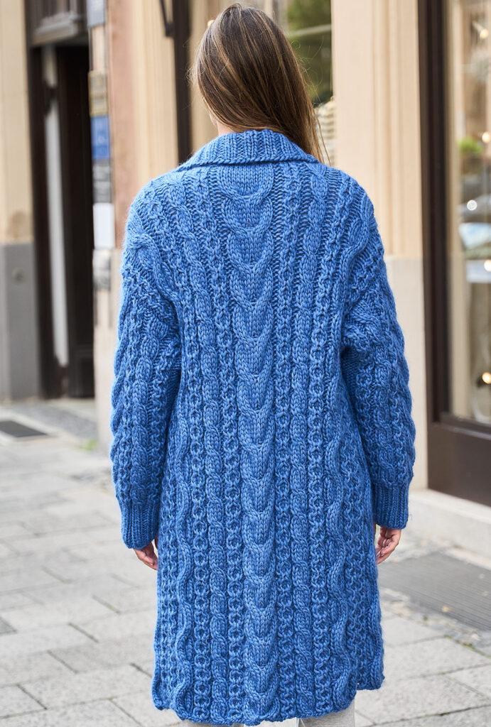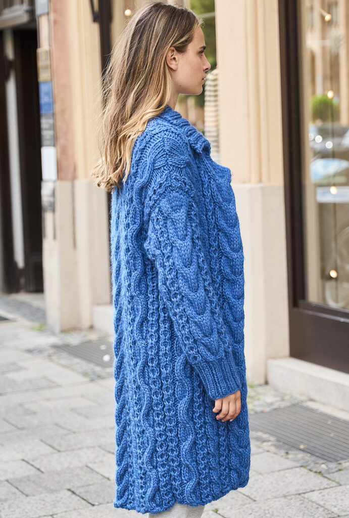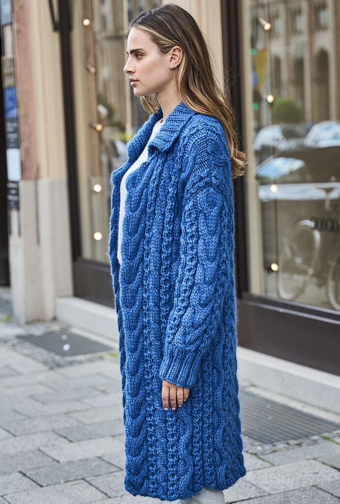Mit hellgrauen Joggpants und silbernen Boots passt dieser royalblaue Mantel perfekt zum Easy-Glam-Look. An sich schon Hingucker genug. Aber das voluminöse Chunkgygarn zieht Blicke auf sich: Es ist zwar dick, dabei aber ausgesprochen weich und anschmiegsam. Dazu bringt die reichhaltige Zopfvielfalt zusätzlich Dynamik und Spannung in die Masche. Wir haben für alle Zöpfe übersichtliche Strickschriften gefertigt, die Dir die Arbeit erleichtern. Gedoppelte Blenden an den Vorderteilen, Rippenbündchen an den Ärmeln und der hohe Halskragen halten alles schön in Form.