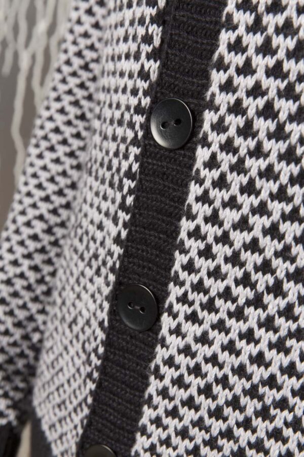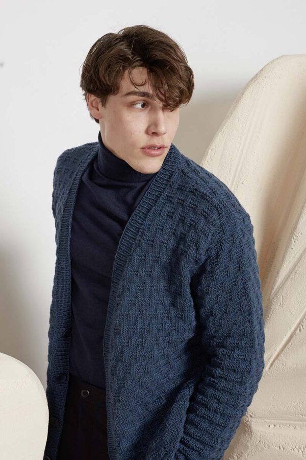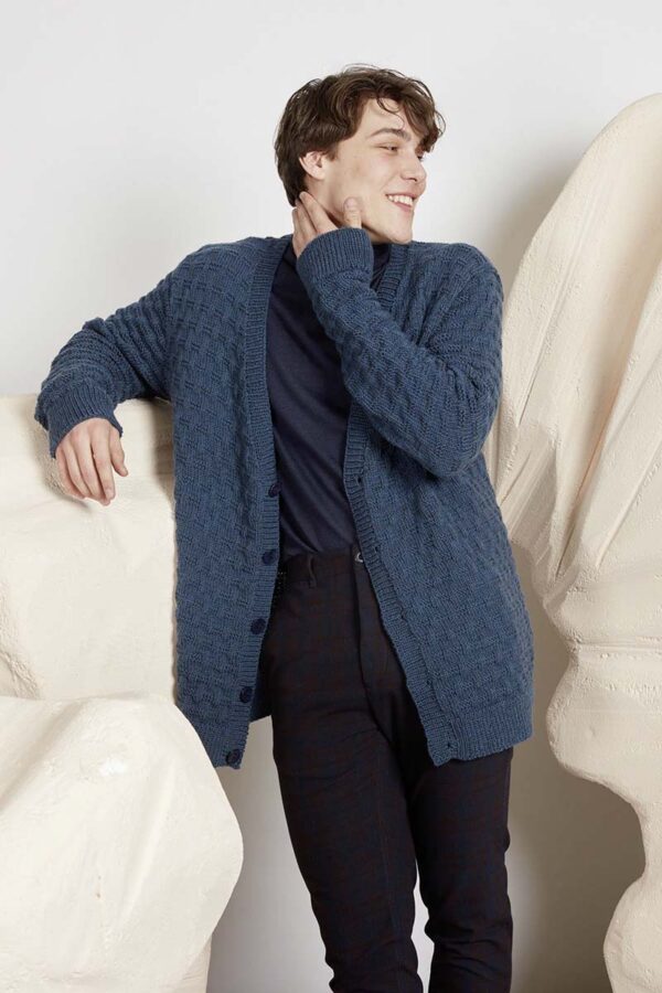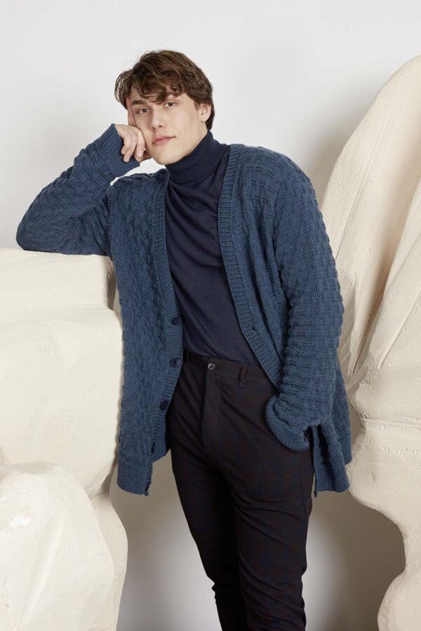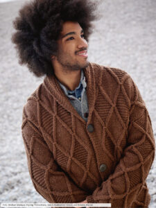 Braun ist eine seiner Lieblingsfarben. Kein Wunder, denn sie passt sich jedem Outfit perfekt an. Hier als sportliche Jacke, die allover mit markanten Rautenstrukturen überzogen ist und die durch das griffige Schurwollgarn sehr ausdrucksvoll zur Geltung kommen. Die Knopfblende an den Vorderteilen wird gleich mit angestrickt und geht im oberen Bereich in einen wärmenden Schalkragen über. Die passenden Knöpfe kannst du direkt beim Hersteller bestellen.