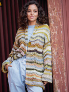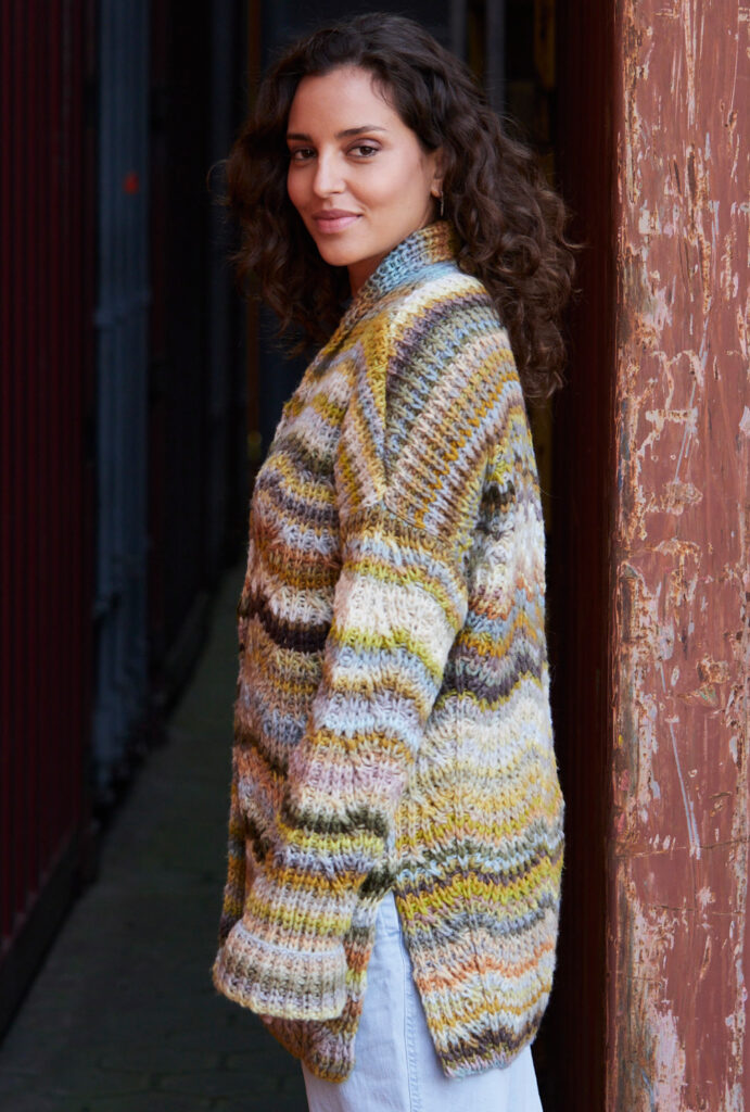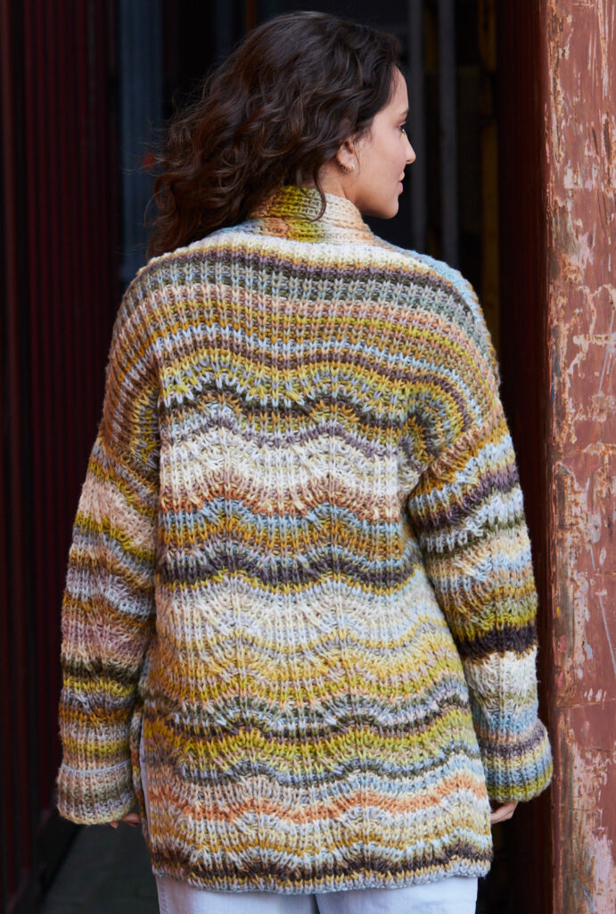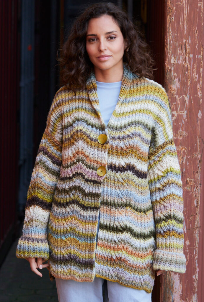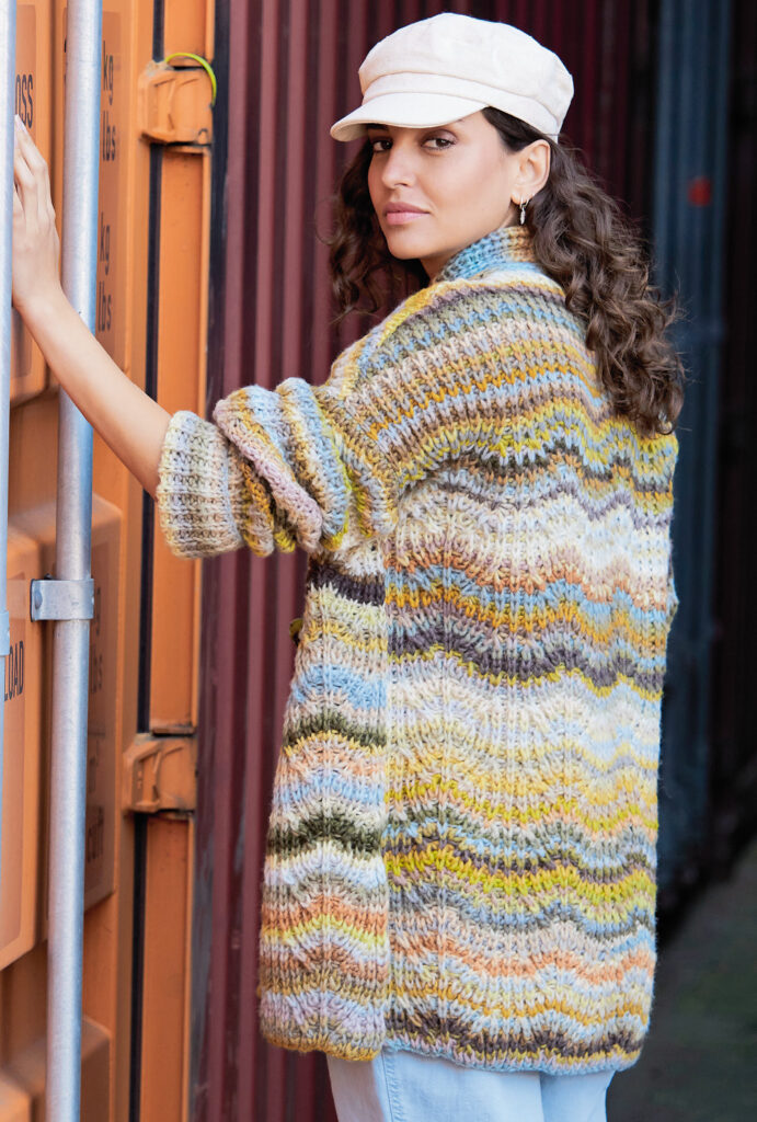 Wenn bei einem Verlaufsgarn so viele Farben aus dem Knäuel kommen, kann man eigentlich auf Muster verzichten. Wir haben trotzdem Rippenstrukturen für die Wellen-Optik hinzugefügt. Diese Strukturen sind im Prinzip Halbpatentmaschen, die geschickt zugenommen und wieder zusammengestrickt werden. Eine extra angestrickte Knopfblende erübrigt sich, sie wird gleich im Halbpatent mitgearbeitet und läuft am Ende um den Halsausschnitt weiter, so dass sich ein Schalkragen ergibt. Die vorteilhafte Länge der Jacke lässt so manches Kilo zu viel um die Hüften verschwinden. Eine Anleitung gibt es für die Größen 38/40, 42 und 44/46.