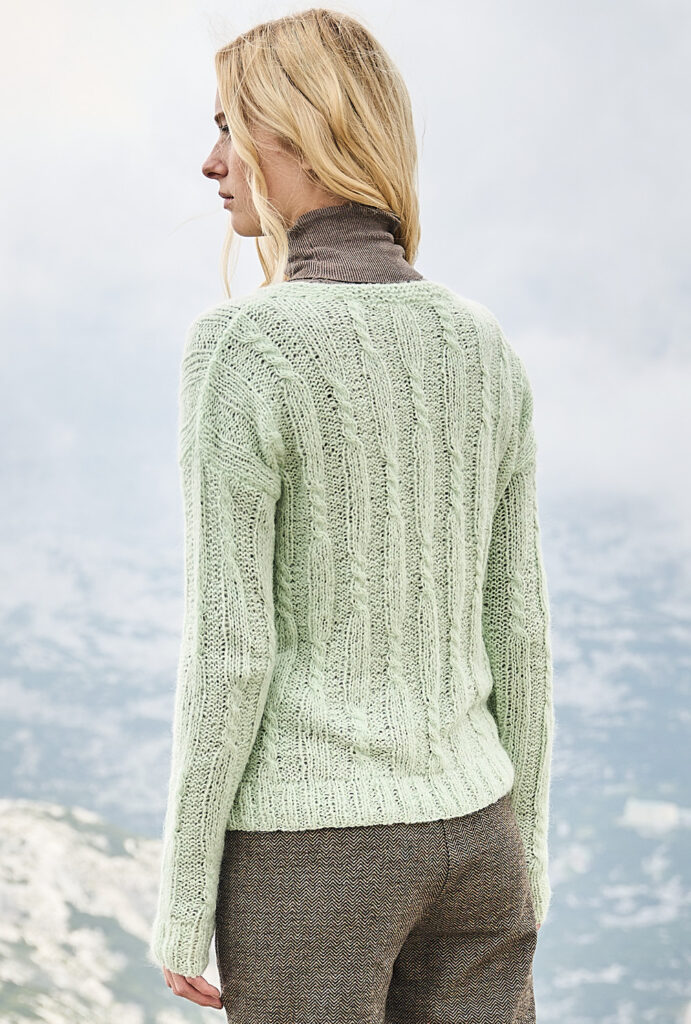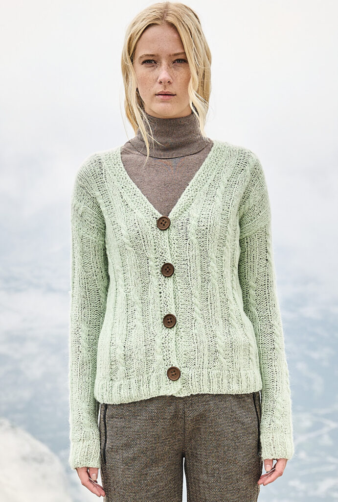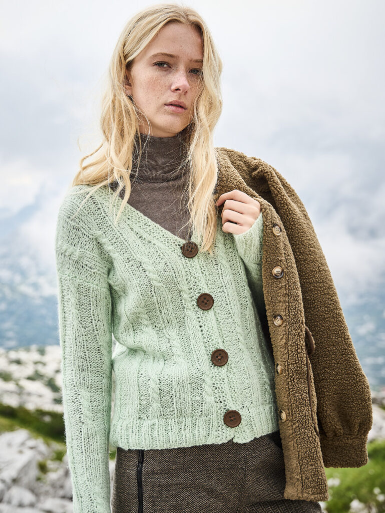Klassisch und zeitlos schön: Der mintgrüne Cardigan vervollständigt jedes Outfit und begeistert durch das federleichte Flauschgarn, das zu jeder Jahreszeit zum Einsatz kommen kann. Im Winter trägt man ihn mit Unterziehrolli und Plüschjacke, im Frühjahr macht er auch zu Kleidern oder Röcken eine gute Figut. Die schmalen Zopfstreifen werden versetzt angeordnet und ergeben so ein harmonisches Allover-Muster. Das Finish bilden Knöpfe, die sich entweder in akzentuierender oder monochromer Farbe in Szene setzen.