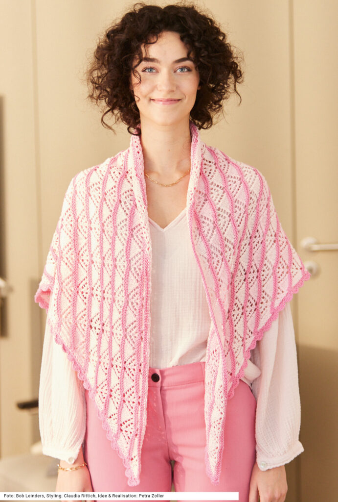Dieses Dreieckstuch aus reiner weicher Baumwolle ist perfekt für Frauen, die einen sanften, femininen Look mögen. Kraus-rechts-Rippen in kräftigem Pink trennen die Ajourstreifen in zartem Rosé und Blassrosa voneinander. Die Umrandung an den schrägen Seiten besteht aus einer gehäkelten Muschelborte in Pink. Für die Spitze, also den Beginn, gibt es eine ausführliche Strickschrift, in der auch der fortzuführende Rapport für das Ajourmuster enthalten ist. Die Anleitung dazu kann für ein Tuch in der Größe 155 x 83 cm downgeloadet werden.