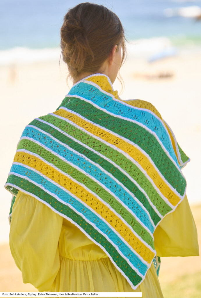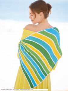 Mit diesem Dreiecktuch gibst du deinem Outfit im Handumdrehen eine heitere Note. Hübsche kleine Ajour- und Lochmuster in vier Farben werden durch kraus rechts gestrickte weiße Linien getrennt. Begonnen wird an einer Schrägseite und durch Abnahmen an einer Seite entsteht ein Dreieck, das ebenfalls mit weißen kraus rechten Reihen eingerahmt ist. Die Anleitung für ein Garn aus reiner Baumwolle steht für ein Dreieck mit in der Größe 90 x 116 cm bereit.