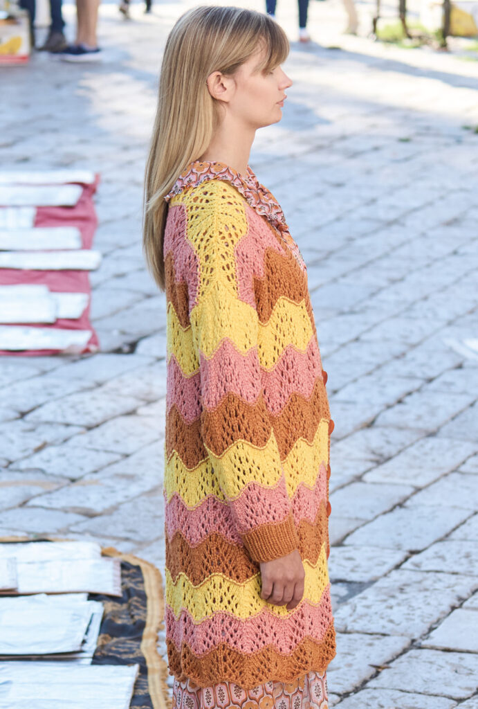Mehr Energie, mehr Dynamik – das verspricht die kühne Kombination aus Braun, Rosa und Gelb. Der gelungene Farbmix wird durch ein schwungvolles Wellenmuster akzentuiert, für das wir in unserer Anleitung eine übersichtliche Strickschrift hinterlegt haben. Die einfache Schnittform mit leichten Schulterschrägungen und gerade eingesetzten Ärmeln ist auch von weniger versierten Strickerinnen zu bewältigen. Nur bei der Verschlussblende aus rechten und linken Maschen heißt es aufgepasst, da hier Knöpfe und Knopflöcher ins Maschenspiel kommen.