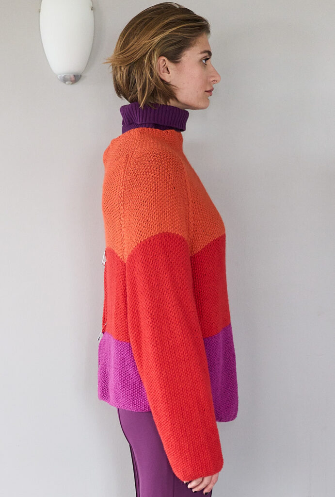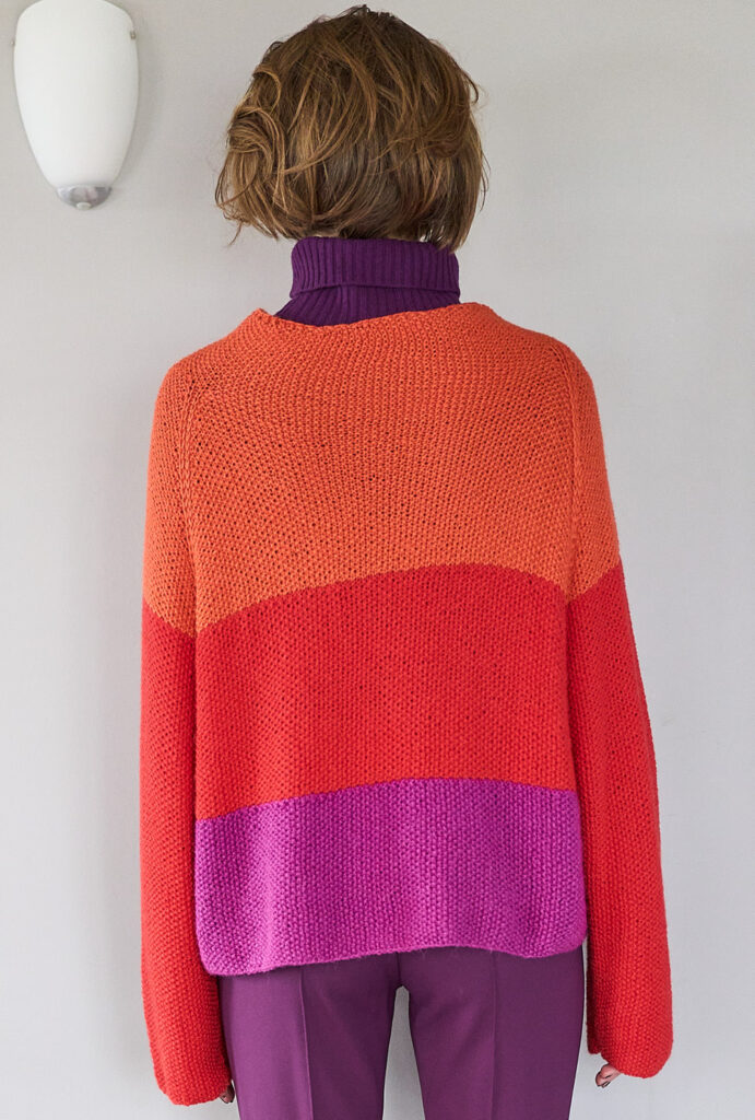Helles Scharlachrot, fruchtiges Kirschrot und tiefes Weinrot wirken besonders edel, wenn man sie miteinander kombiniert. Schönstes Beispiel ist dieser Sweater, dessen breites Streifendesign auf der ganzen Linie überzeugt. Hinzu kommen die dezenten Perlstrukturen, die Spannung in die Masche bringen. Die etwas längere Rückenteilkante hat einen abgerundeten Kantenverlauf, den man durch verkürzte Reihen erzielt. Die vier Teile werden bis zur Raglanpasse separat in Reihen gearbeitet, danach geht’s ganz easy in Runden weiter, eine nicht allzu hohe Kragenblende bildet den Abschluss.