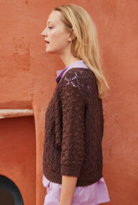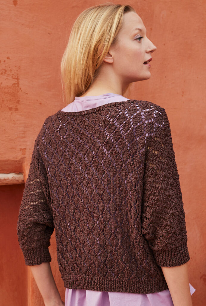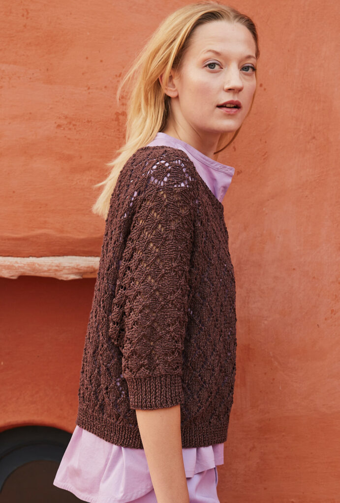 Strapazierfähig, schmutzabweisend und bei wärmeren Temperaturen atmungsaktiv: Wir lieben Leinen! Hier als salopper Fledermauspulli mit kurzen Ärmeln, der ganz entspannt aus einem Lochrautenmuster entsteht, das sich gleichmäßig über das Gestrick verteilt. Dafür haben wir eine übersichtliche Strickschrift angefertigt, mit der du schnell zum Erfolg kommst. Und eines ist klar: Der warme Haselnuss-Ton schmeichelt jeder Frau und sieht zu lavendelfarbenen Accessoires einfach umwerfend aus.