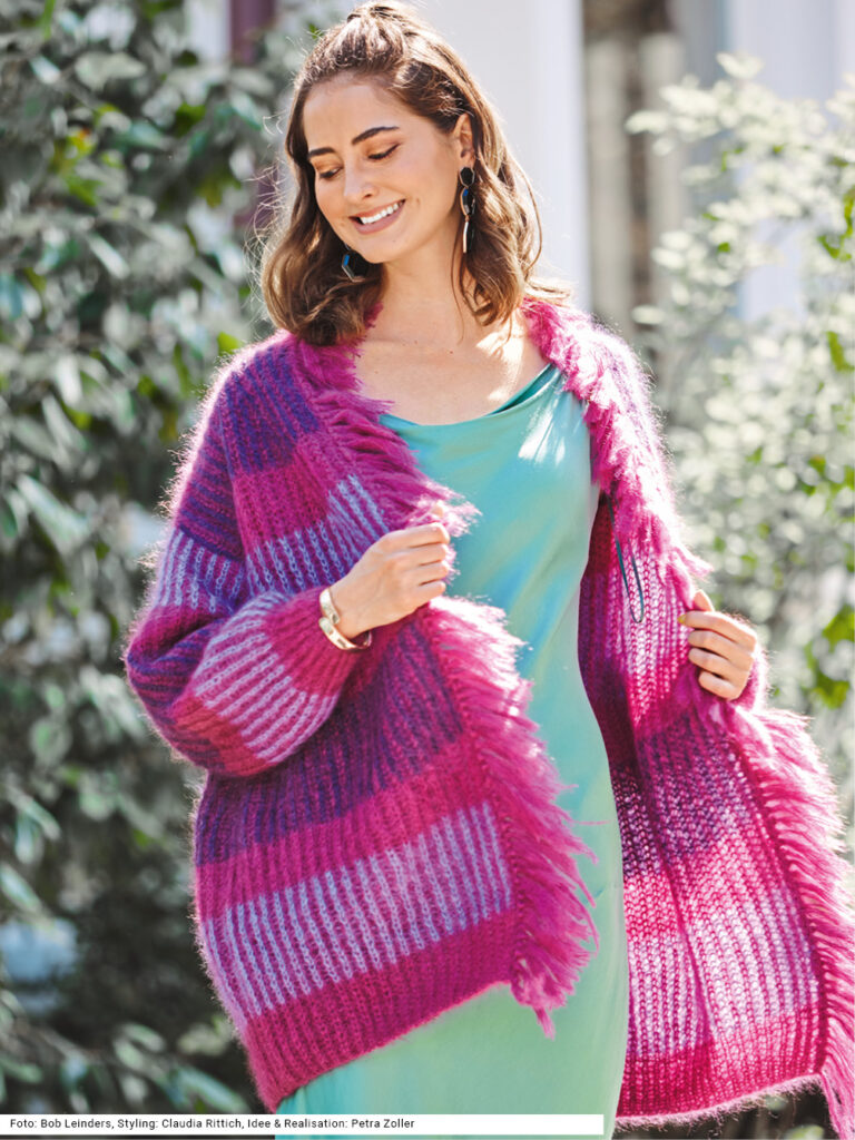 Diese flauschige Jacke im Patentmuster mit kraftvollen Blockstreifen in Beerentönen ist lässig geschnitten, denn alle Teile werden ganz gerade gearbeitet. Fluffige lange Fransen in Weinrot am vorderen Rand und um den Halsausschnitt lockern den Look auf. Ein edles Garn aus Mohair und Seide lässt die Jacke warm und dennoch leicht sein. Die breiteren Streifen werden mal zweifarbig in Flieder und Weinrot bzw. Violett und Weinrot, die schmaleren nur in Weinrot gestrickt. Der Bund und die Ärmelbündchen sind im Halbpatent in Weinrot gearbeitet. Eine Anleitung steht in den Größen 38/40, 42/44 und 46/48 bereit.