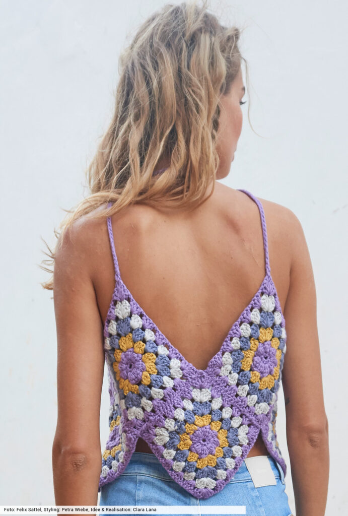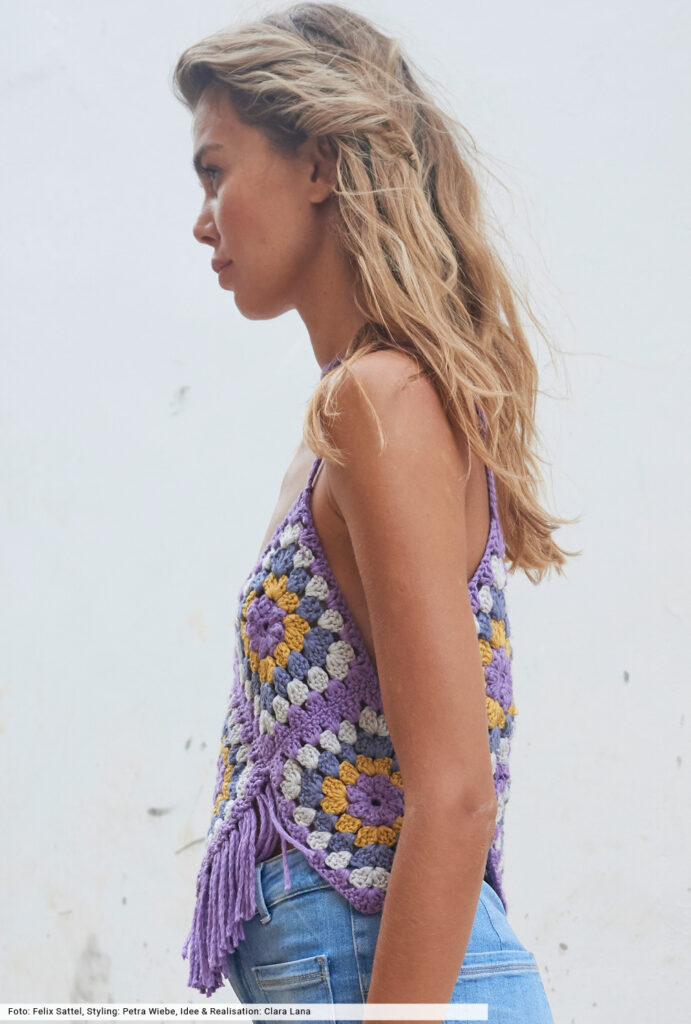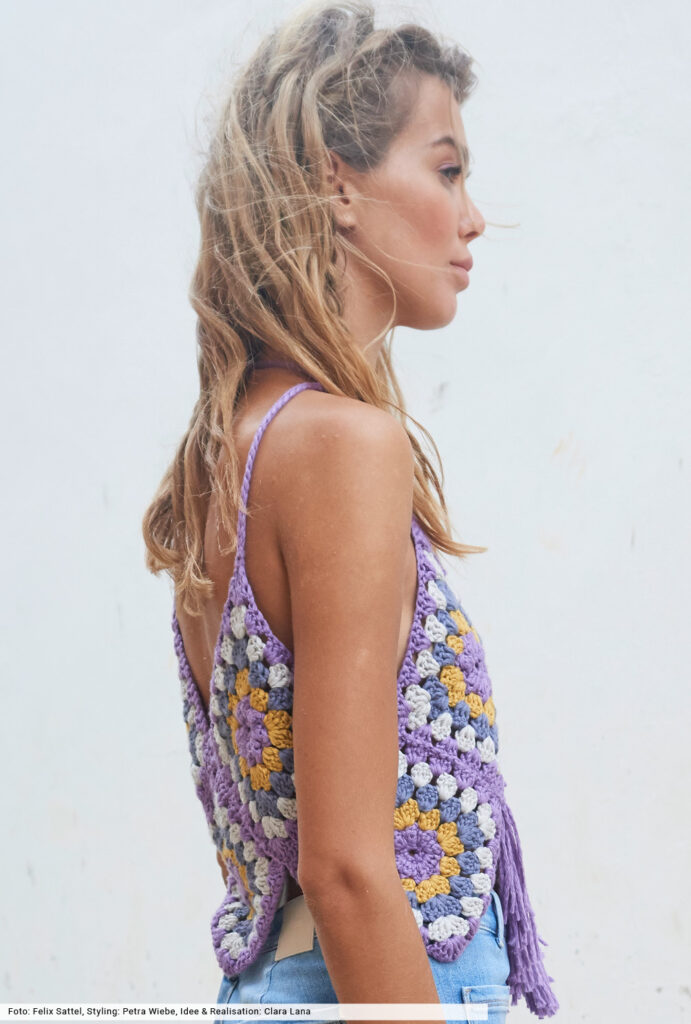 Tradition trifft Moderne: Denn mit mehrfarbigen Grannys arbeiten wir schon lange, normalerweise entstehen daraus Decken oder Tücher. Und jetzt kommt die Moderne, bei der wir die Häkelquadrate laut einer Schnittvorlage zu einem frechen Top zusammengenäht haben. Zum Schluss mit schmalen Trägern und langen Fransen ausgestatten, fertig ist ein absolutes Boho-Highlight. So machen wir den Hippie happy!