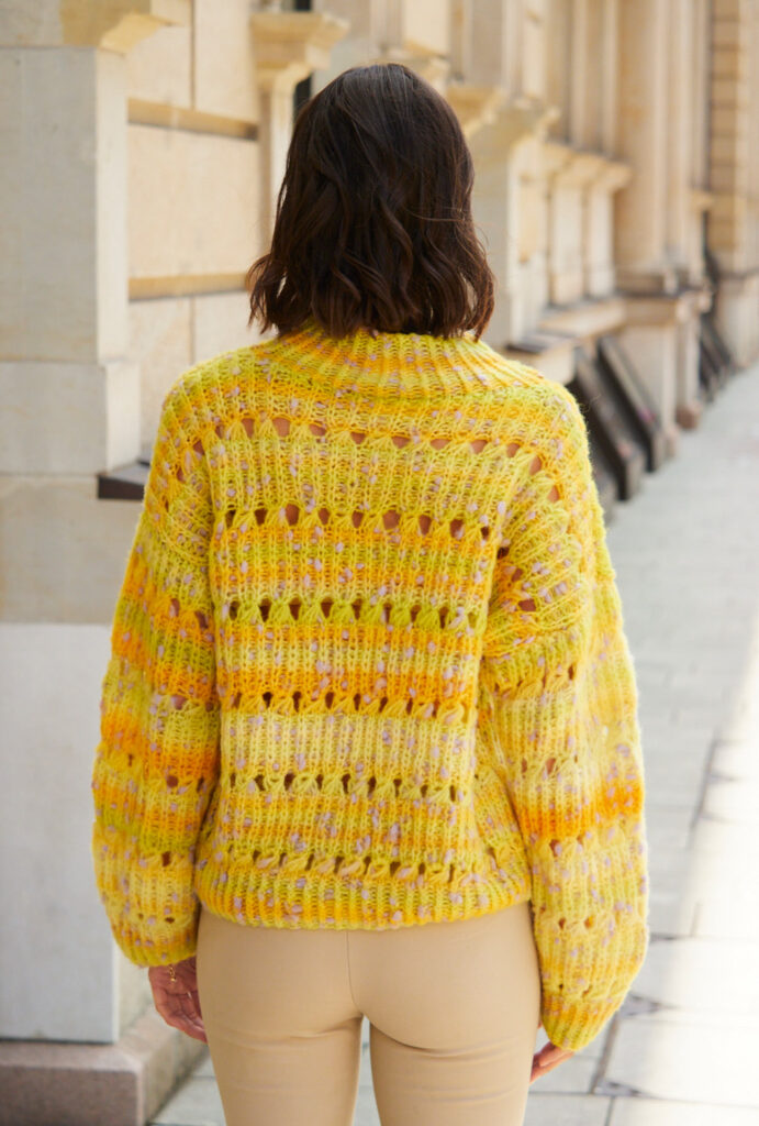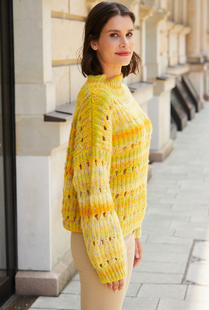 Dieser lässige Pulli mit Fallmaschenstreifen zwischen den Halbpatentstreifen beweist, dass die Zeiten, in denen Tweedgarne vor allem für robuste Outdoor-Looks verwendet wurden, längst vorbei sind. Die strahlenden Gelbnuancen von Goldgelb bis Gelbgrün verbinden sich hier mit Fliedernuancen – eine strahlend schöne, selbstbewusste Kombination! Weich und anschmiegsam ist Garn aus Schurwolle mit Polyamid- und Alpaka-Beimischung obendrein. Die Bündchen und der Turtleneckkragen sind 1 rechts verschränkt, 1 links gestrickt. Die Anleitung dazu steht in den Größen 38/40, 42/44 und 46/48 zur Verfügung.