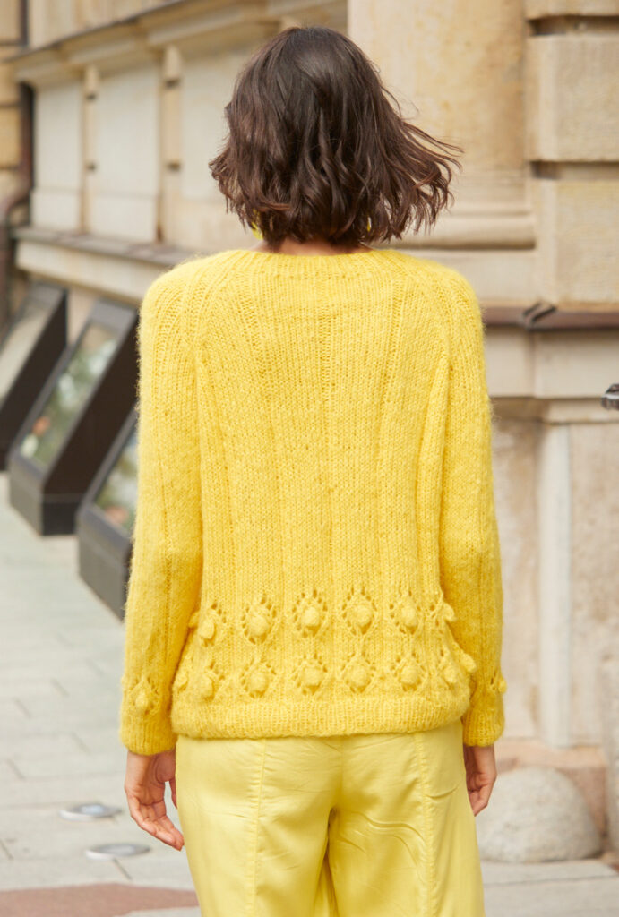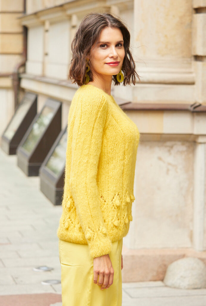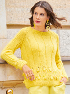 Ein Raglanpulli aus prinzipiell simplen Rippenstreifen in glatt rechts und glatt links bekommt eine enorme Aufwertung durch das Ajourmuster mit dicken Noppen oberhalb des Bunds – und auch an den Ärmeln. Die Raglanschrägungen werden mit einem schmaleren Rippenmuster gearbeitet, die betonten Abnahmen heben die Schrägungen hervor. 1/1-Rippen bilden die Bündchen und die Halsausschnittblende. Das Garn aus halb Alpaka, halb Schurwolle ist besonders flauschig und weich, die sonnengelbe Farbe lässt gute Laune aufkommen. Eine Anleitung steht in den Größen 36/38 und 44/46 zur Verfügung.