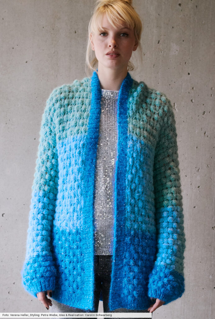 Flauschgarne bieten eine großartige Möglichkeit, jedem Strickteil sofort Charakter zu verleihen. Hier haben wir noch eine glitzerndes Beilaufgarn hinzugefügt, das den Aquatönen allover den prachtvollen Glanz verleiht. Ein markantes Strukturmuster gibt der Masche die spannende Optik und wird in der Anleitung genau beschrieben. Wir lieben diese dreifarbige Jacke, die du dir einfach überziehen kannst und die verschlusslos trotzdem wärmt.