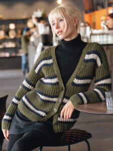 Die Vorzüge einer Strickjacke liegen auf der Hand: Sie ist zeitlos, leicht zu kombinieren und rundet Ihre Herbstgarderobe perfekt ab. Dieses Modell wird allover im Halbpatentmuster gestrickt und zwar so, dass die etwas unruhigere Seite außen liegt. Hinzu kommt ein Streifendesign, bei dem sich Oliv, Natur und Schwarz regelmäßig abwechseln und somit für die spannende Optik sorgt. Schmale Rippenblenden und eine Knopfleiste vervollständigen den Look.