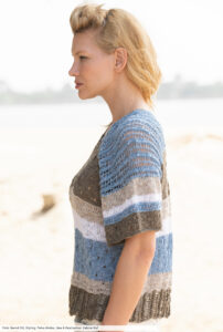 Der harmonische Mix aus Blau- und Terratönen macht dieses lässige Strickshirt zum Hiingucker. Dazu kommt noch die attraktive Kreation aus Loch- und Fallmaschenmustern, die streifenweise zum Einsatz kommen. Du strickst das Teil über die Schultern hinweg und auch die Kurzärmel sind aufgefasst, sodass du nur die Seitennähte schließen musst. Das Garn besteht aus Leinen, Viskose und Baumwolle – ein Garant dafür, dass du auch an heißen Tagen cool bleibst.