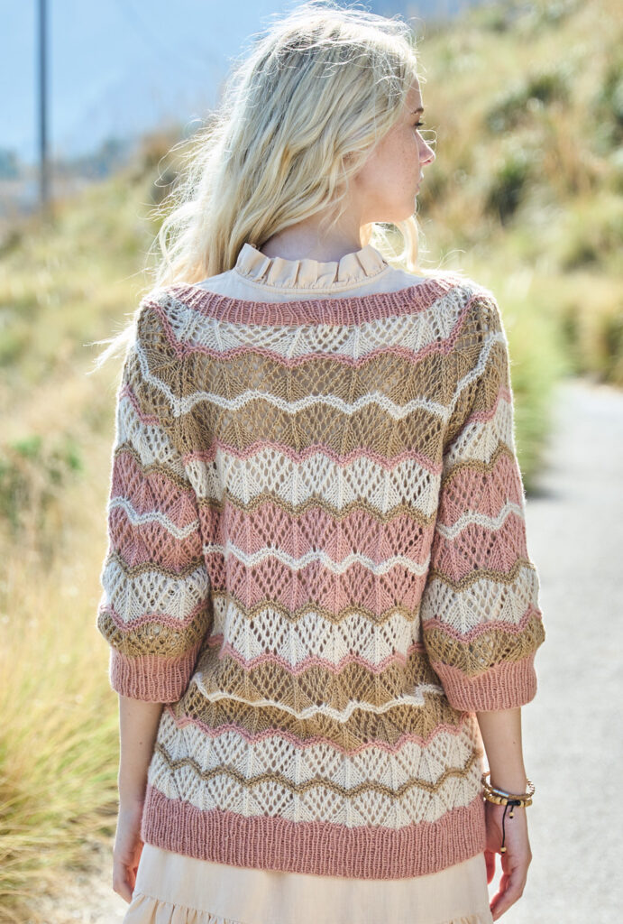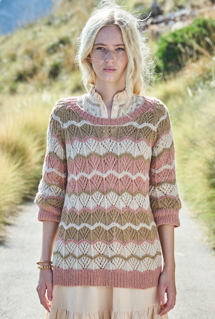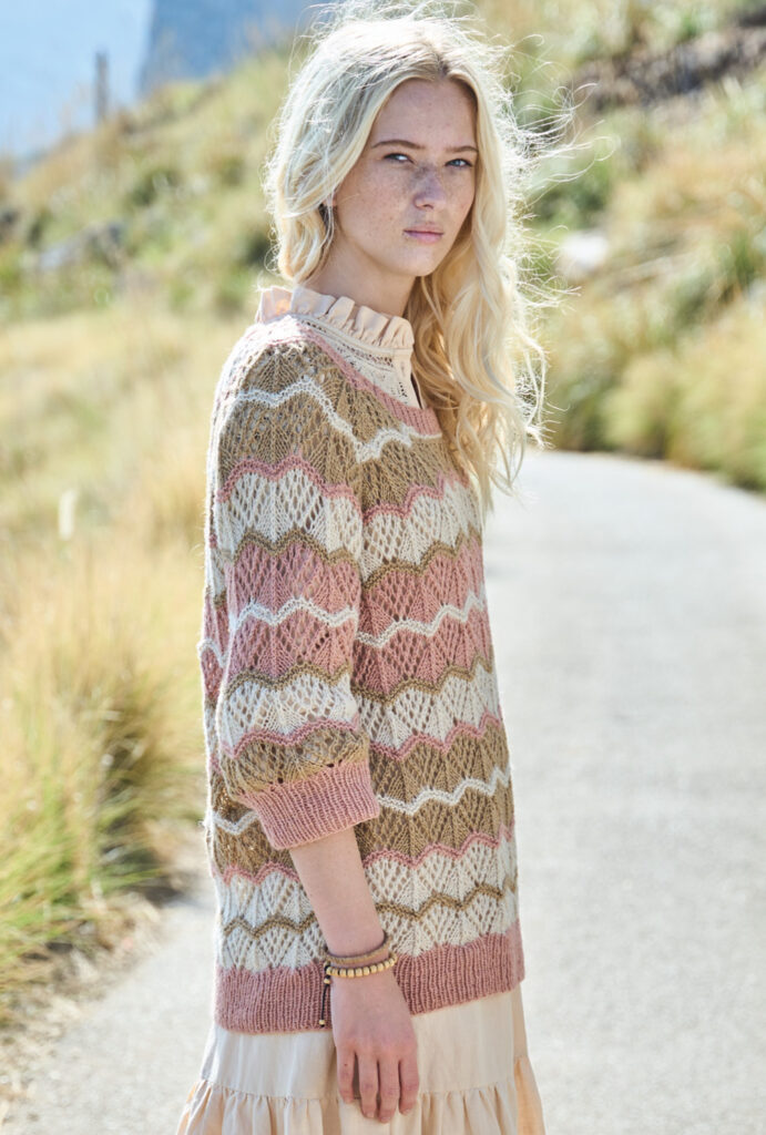 Wellenstrukturen sind einfach zu stricken und erzielen durch den raffinierten Einsatz unterschiedlicher Farbstreifen einen ganz individuellen Look. Hier sind es Rosa, Braun und Beige, die sich zur einem harmonischen Mix zusammentun und einen tollen Raglanpulli entstehen lassen, den es nicht von der Stange zu kaufen gibt. Das weiche Garn, das durch einen ganz zarten Flausch heraussticht, besteht hauptsächlich aus Baumwolle, zu der sich Alpaka, Seide und Schurwolle gesellen – ein spannende Mischung, die auch im Herbst Tragekomfort garantiert.
