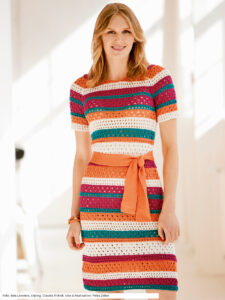 Ein starker Auftritt ist garantiert mit diesem figurbetonten Kleid aus Baumwolle-Viskose-Mischgarn. Es ist nicht nur farbenfroh, sondern überzeugt auch mit einem spannenden Mix aus Kreisel- und Lochmuster. Die kräftigen Farbstreifen tun ihr Übriges, denn Orange, Natur, Pink und Petrol setzten sich gut voneinander ab. Der orangefarbene Bindegürtel im Rippenmuster gibt einen zusätzlichen Akzent. Ärmel mit Armkugel passen sich exakt in den Armausschnitt. Der runde Halsausschnitt bekommt zum Schluss noch einen I-Cord-Rand in Orange. Eine Anleitung gibt es für die Größen 36/38, 40/42 und 44/46.