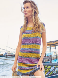 Ein in sich leicht changierendes Garn in Gelb-, Graublau- und Lilatönen wäre an sich schon Abwechslung genug. Wenn dann auch noch verschiedene Lochstrukturen streifenweise ins Maschenspiel kommen, entsteht daraus ein freches Minikleid, das es nicht von der Stange zu kaufen gibt. Die Muster haben wir teilweise verbal beschrieben, für das größere Ajourmuster gibt es eine Strickschrift direkt bei der Anleitung. Die schmalen Blenden an den Armausschnitten und am Halsrand werden in I-Cord-Technik angebracht.