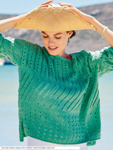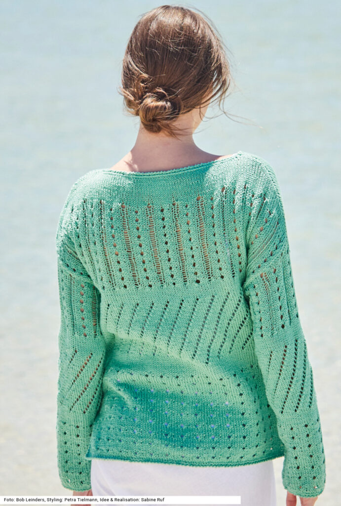 Dieser Pulli mit verlängertem Rückenteil ist ein wunderbarer Allrounder für jeden Tag. Die drei Lochmuster-Varianten sorgen zudem für Dynamik im Look. Alle Muster sind nach den entsprechenden Strickschriften einfach zu arbeiten; zwischen den breiten Streifen trennen schmale, glatt rechte Streifen sie sauber voneinander ab. Die gerade geschnittenen Ärmel lassen sich problemlos einnähen. Durch den oversized konzipierten Schnitt fällt die Schulterpartie lässig über. Alle Ränder werden zum Schluss mit je 1 Runde fester Machen und Krebsmaschen umhäkelt. Dazu ein grünes Garn aus Baumwolle mit einem leicht glitzernden Polyester-Beilauffaden. Eine Anleitung gibt es für die Größen 38/40, 42/44 und 46/48.
