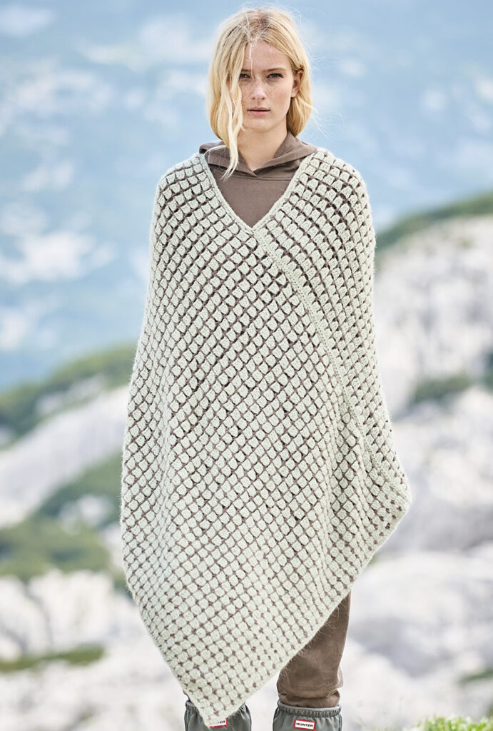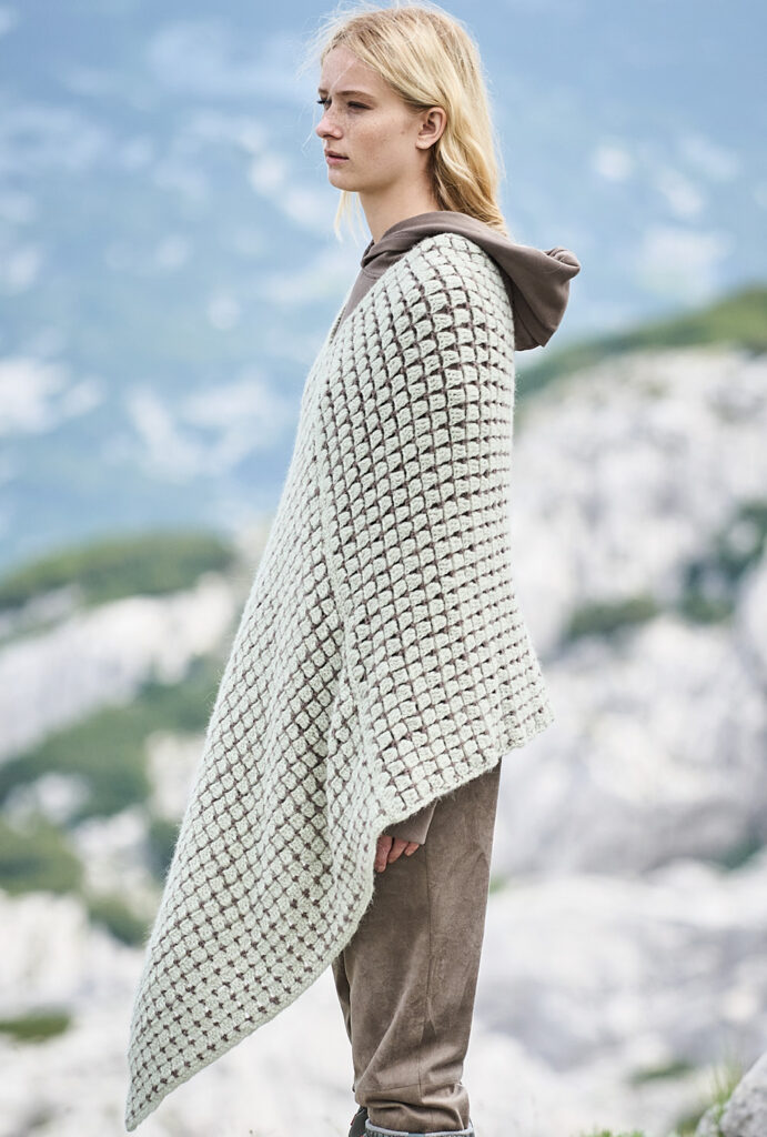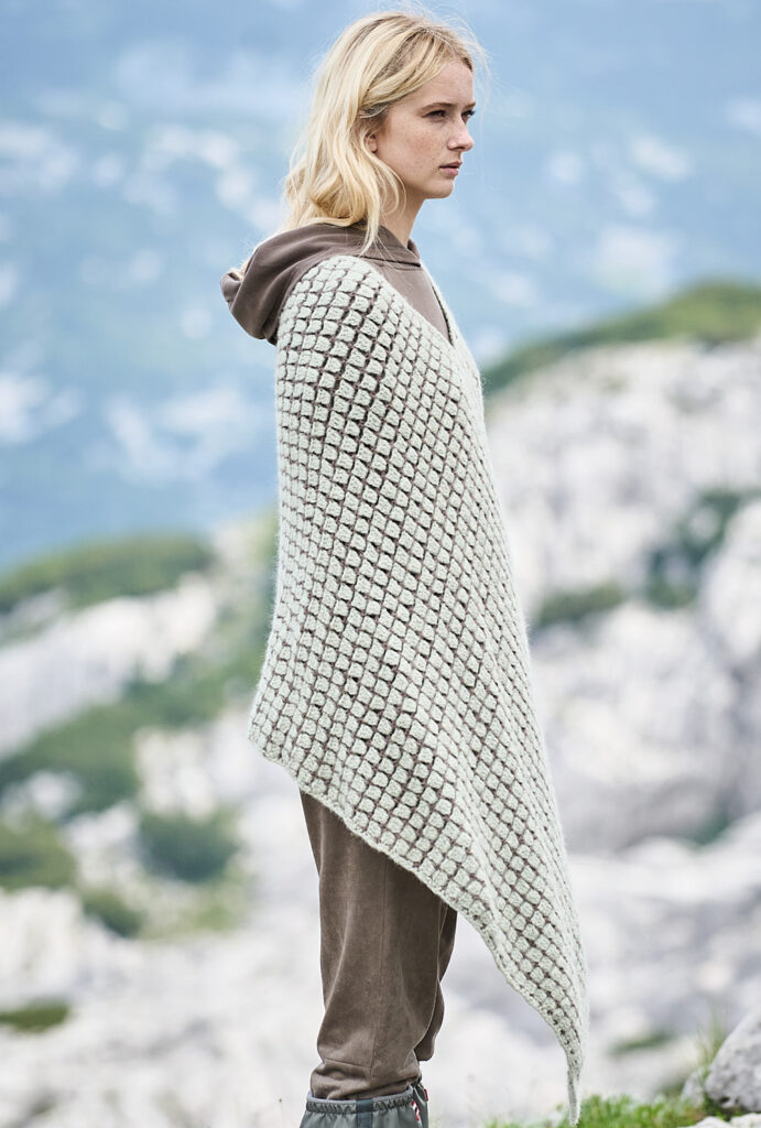 Wer schon lange nicht mehr gehäkelt hat, kann sich hier voll und ganz auf das Muster aus Luftmaschen, Stäbchen und festen Maschen konzentrieren. Denn dieser tolle Poncho entsteht aus einem Rechteck, das zum Schluss an den seitlichen Rändern zusammengenäht wird. Besonders reizvoll ist auch die Kombination aus hellem Mint und warmem Braun – ein Farbkontrast, dem man nicht alle Tage sieht. Das weiche Alpakamixgarn sorgt für den lockeren Fall und umhüllt die Körperkonturen. Unser Fazit: wärmstens zu empfehlen!