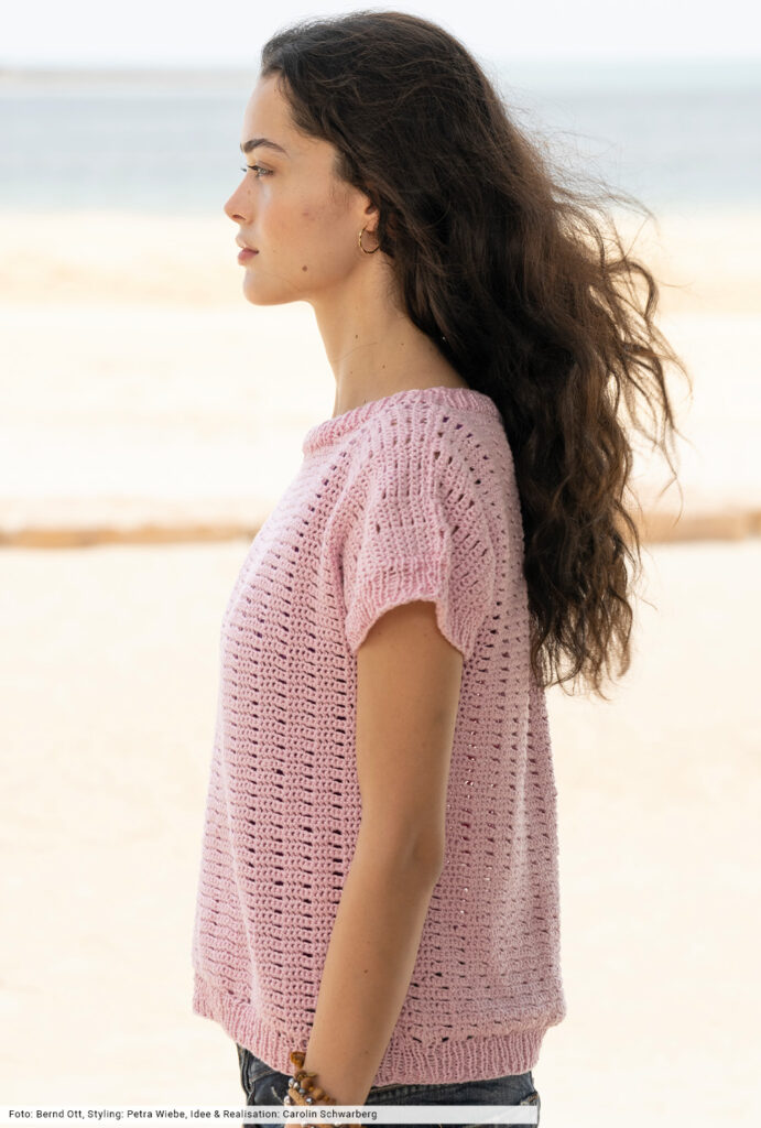 Weniger ist oft mehr und ist auch unkompliziert nachzuarbeiten: Bei diesem schlichten Häkelshirt aus rosafarbener Baumwolle haben wir bewusst auf schwierige Muster verzichtet, sodass auch Anfängerinnen, vorallem Häkelneulinge, zum Erfolg kommen. Überschnittene Schultern sorgen für die anschmiegsame Form, die schmalen Rippenkanten werden zum Schluss angestrickt. Dafür musst du mit der Rundstricknadel aus den Saumkanten, den Ärmelrändern und dem Halsausschnitt die in der Anleitung angegegebene Maschenzahl auffassen und einfach immer 1 Maschen rechts und eine Maschen links im Wechsel stricken.