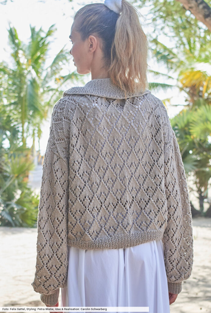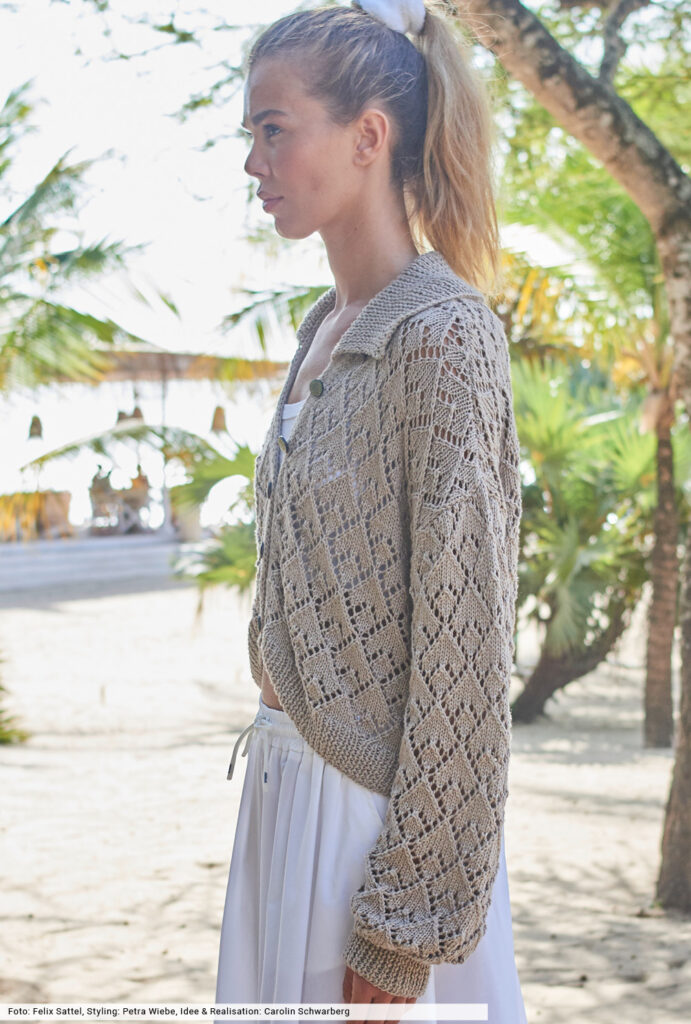 Kleiner Aufwand – große Wirkung: Bei dieser Ajourjacke entstehen die verkürzten Vorderteile durch eine Rippenblende, die wir gleich mit angestrickt haben. Durch die darin enthaltenen abgehobenen Maschen zieht sich der innere Rand zusammen und lässt die bauchnabelfreie Form entstehen. Jetzt nur noch alle Teile zusammennähen, mit einem Rippenkragen und schönen Knöpfen ausstatten, fertig ist ein Teil, das dich den ganzen Sommer begleiten wird.