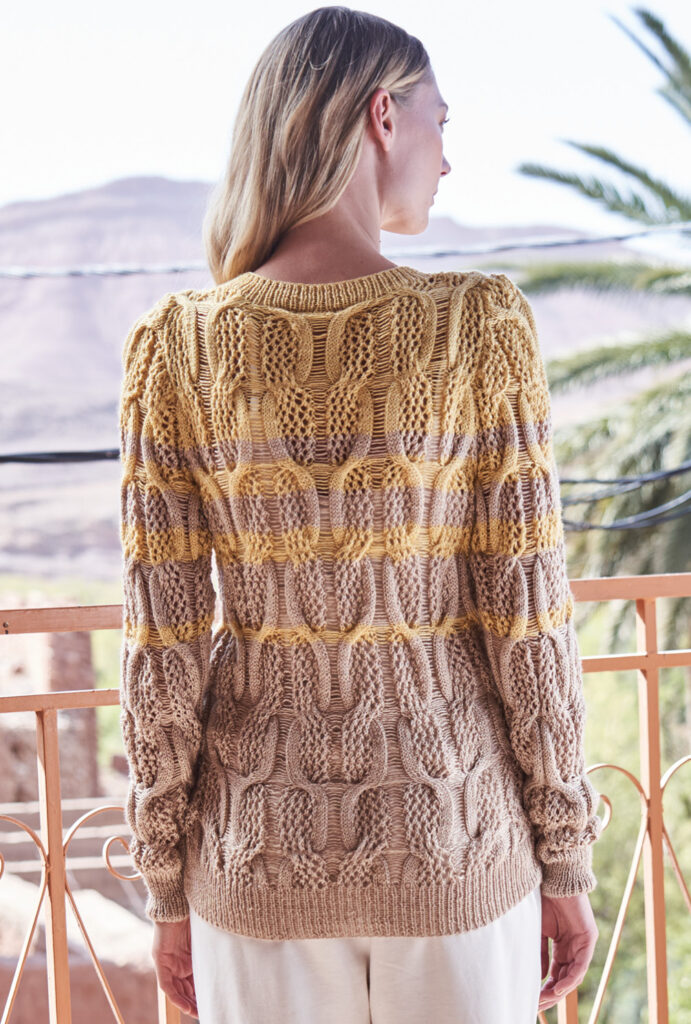 Cardigans gehören jetzt in jede Frühjahrsgarderobe. Besonders, wenn sie so schön sind, wie dieses Design. Gestrickt aus einem feinen Viskose-Schwurwollgarn, bei dem auch edle Seide mitmischt, sind sowohl Tragekomfort, als auch Strickvergnügen gleich inbegriffen. Das zweifarbig gestreifte Ajour-Zopfmuster ist ein Highlight in Sachen Strickkunst, benötigt aber schon etwas Aufmerksamkeit. Gestrickt wird die Jacke in Einzelteilen von unten nach oben. Direkt nach dem Rippenbündchen werden das Lochmuster und die Zöpfe allover gearbeitet. Nach und nach werden dann die kontrastfarbenen Streifen eingefügt, bis die Jacke oben dann komplett in Gelb ausläuft. Praktisch: Bei den Vorderteilen werden die Blenden gleich mitgestrickt. Sind alle teile geschafft, werden noch die restlichen Blenden gearbeitet, die Knöpfe angebracht und alle Nähte geschlossen. Bedingt durch die Fallmaschen im Loch- Zopfmuster ist die Jacke sehr dehnbar und passt sich dadurch angezogen besonders gut an.