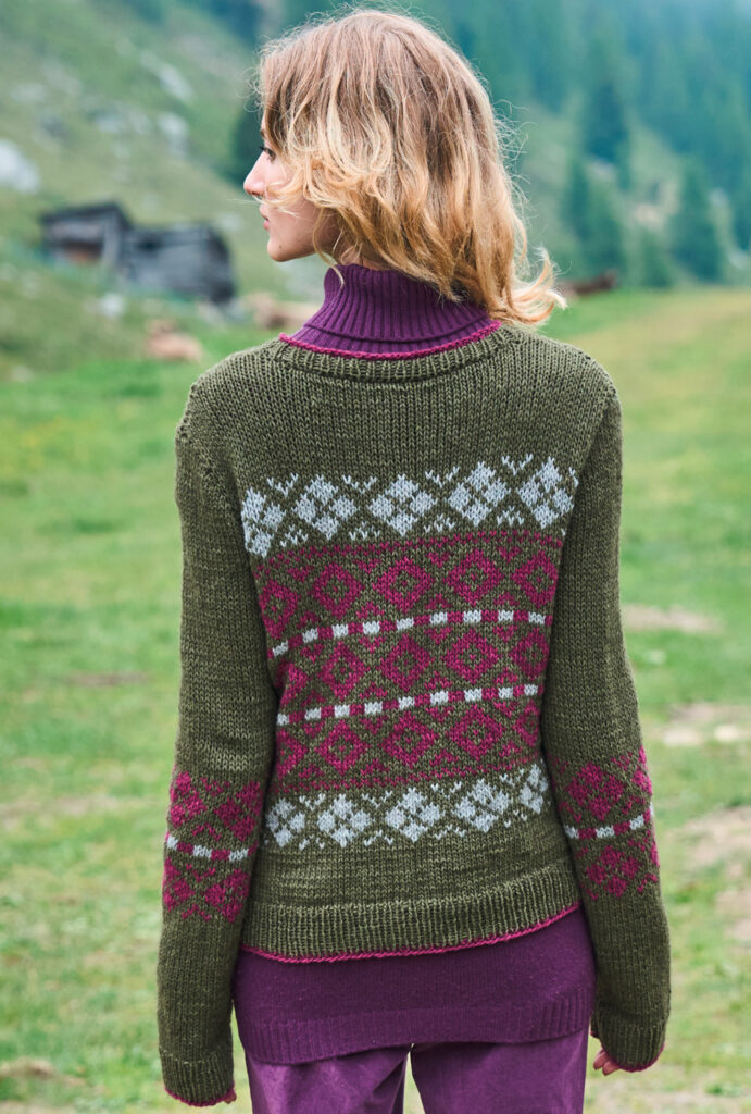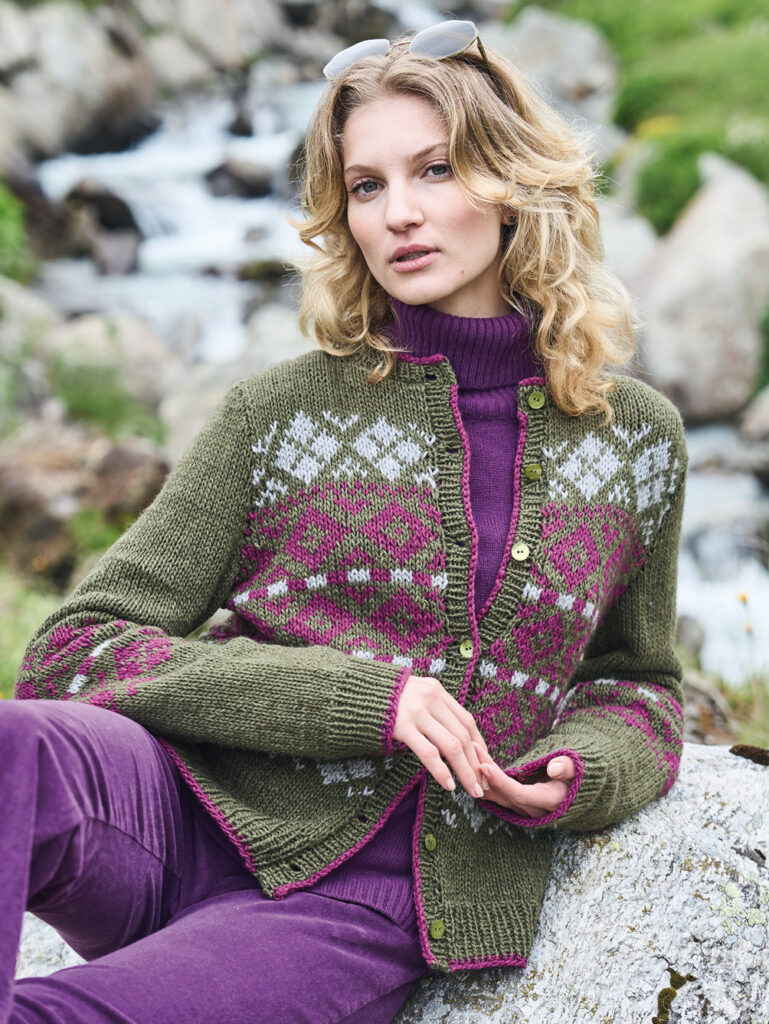 Diese klassisch geschnittene Jacke aus hochwertiger Yak-Schurwolle bietet bei Wind und Kälte hohen Wärmekomfort. Die Jacquardmuster in Zyklam und Hellgrau bilden zum olivgrünen Fond einen starken Kontrast und werden nach übersichtlichen Zählmustern glatt rechts eingestrickt. Dafür musst du in Norwegertechnik arbeiten und den unbenutzten Faden stets locker auf der Rückseite der Arbeit mitführen. Schönes Detail: Die olivgrünen Rippenblenden beginnen in der ersten beziehungsweise enden in der letzten Reihe in Zyklam.