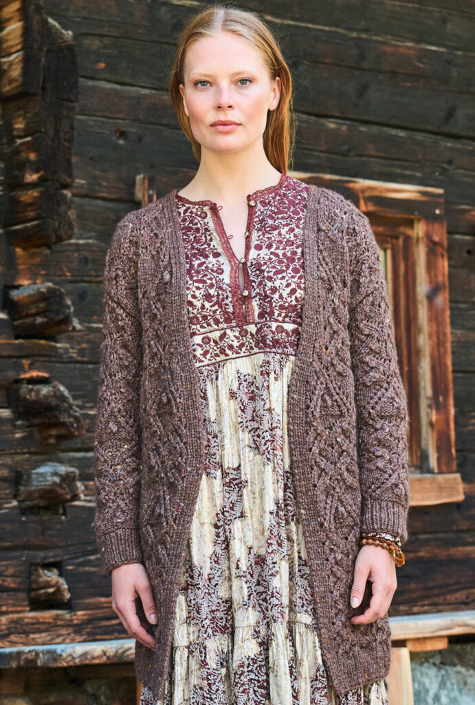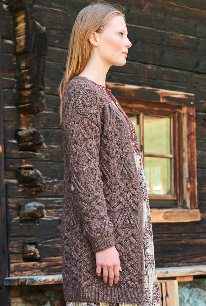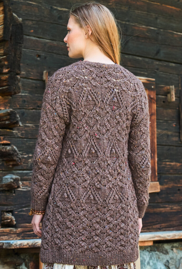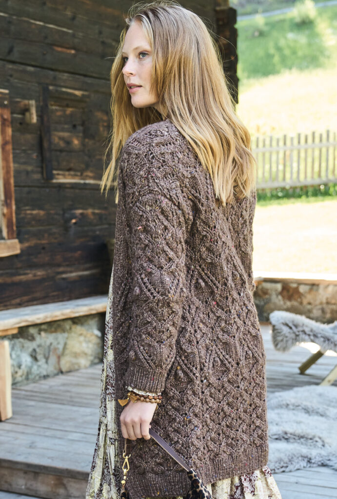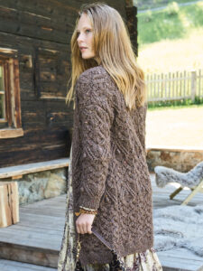 Zu langen Kleidern und groben Stiefeln ist diese Longjacke ein lässiger Hingucker, der auch an kalten Tagen überzeugt. Die plastischen Ajourstrukturen werden mit Noppen kombiniert – das erfordert etwas Zeit, aber mit etwas Übung kommt man schnell zum Ziel. Kleinere Unregelmäßigkeiten beim Stricken verzeiht das Garn, denn es präsentiert sich in einer ungewöhnlichen Textur, die einerseits leichen Tweedcharakter, andererseits weichen Flausch aufweist. Die Vorderteilblenden werden im Rippenmuster gleich mit angestrickt und kommen ohne Knöpfe oder Schnallen aus.