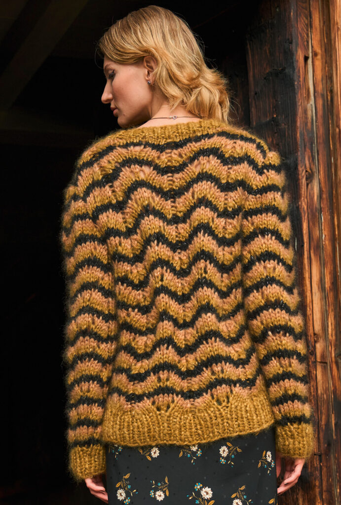 Ein Ajourmuster, das sich schwungvoll in Wellen legt und für das wir eine übersichtliche Strickschrift angefertigt haben, bestimmt die Optik dieses Modells. Dazu drei wunderbar aufeinander abgestimmte Farbtöne und jede Menge Glitzer – bei dieser tollen Jacke setzen wir ganz auf Weilblichkeit und sensuelle Wahrnehmung. Weiteres Plus: Das schimmernde Mohair-Mischgarn wird mit dicken Nadeln gestrickt, mit Rippenblenden eingerahmt und zum Schluss mit hochwertigen Knöpfe verziert.