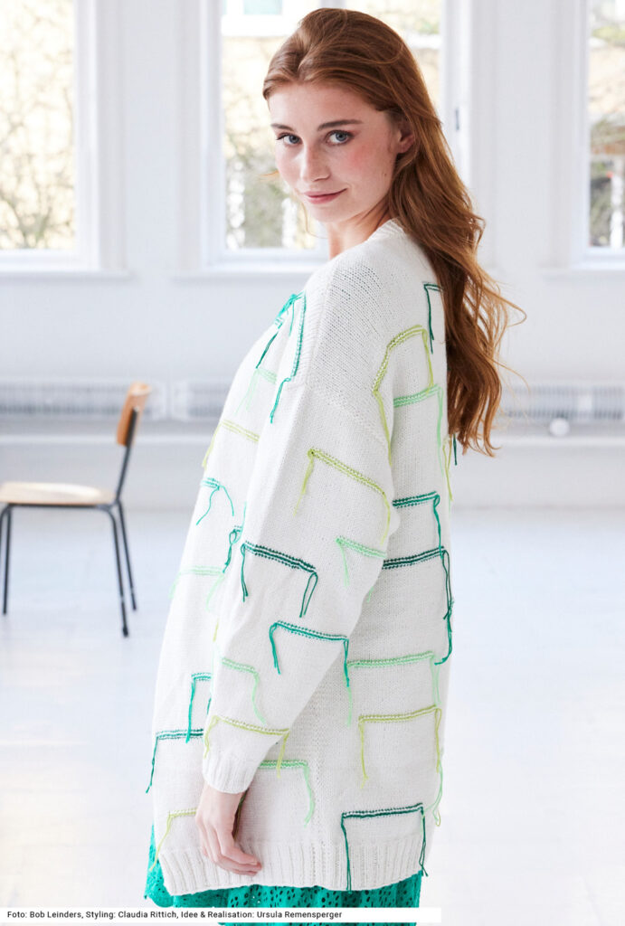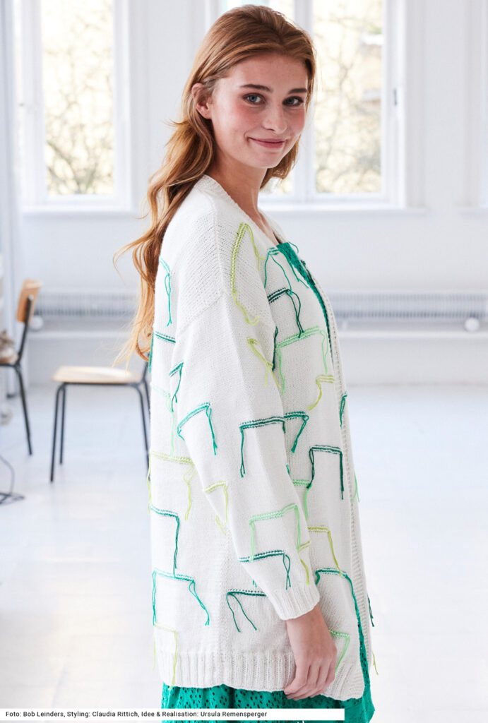 Dieses Duo aus verschlusslosem, lässig geschnittenem Cardigan und großer Umhängetasche passt farblich perfekt zusammen. Die Jacke ist aus einem Mischgarn mit feiner Baumwolle und hochwertiger Viskose gearbeitet, die Tasche aus reinem Baumwollgarn. Die schlicht glatt rechts gestrickten Teile werden durch eingestrickte Streifen in kontrasttierenden Farben unterbrochen. Hier wird der Look durch Fransen unterstrichen. Die Bündchen sind im Rippenmuster, die Vorderteilblenden kraus rechts gearbeitet. Die großzügig dimensionierte Tasche wird in den kraftvollen Farben der eingestrickten Streifen gehäkelt. Eine Anleitung gibt es für die Größen 38/40, 42/44 und 46/48, Tasche: 33 x 29 x 15 cm.