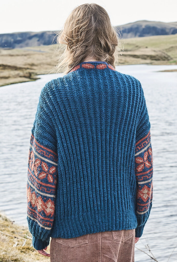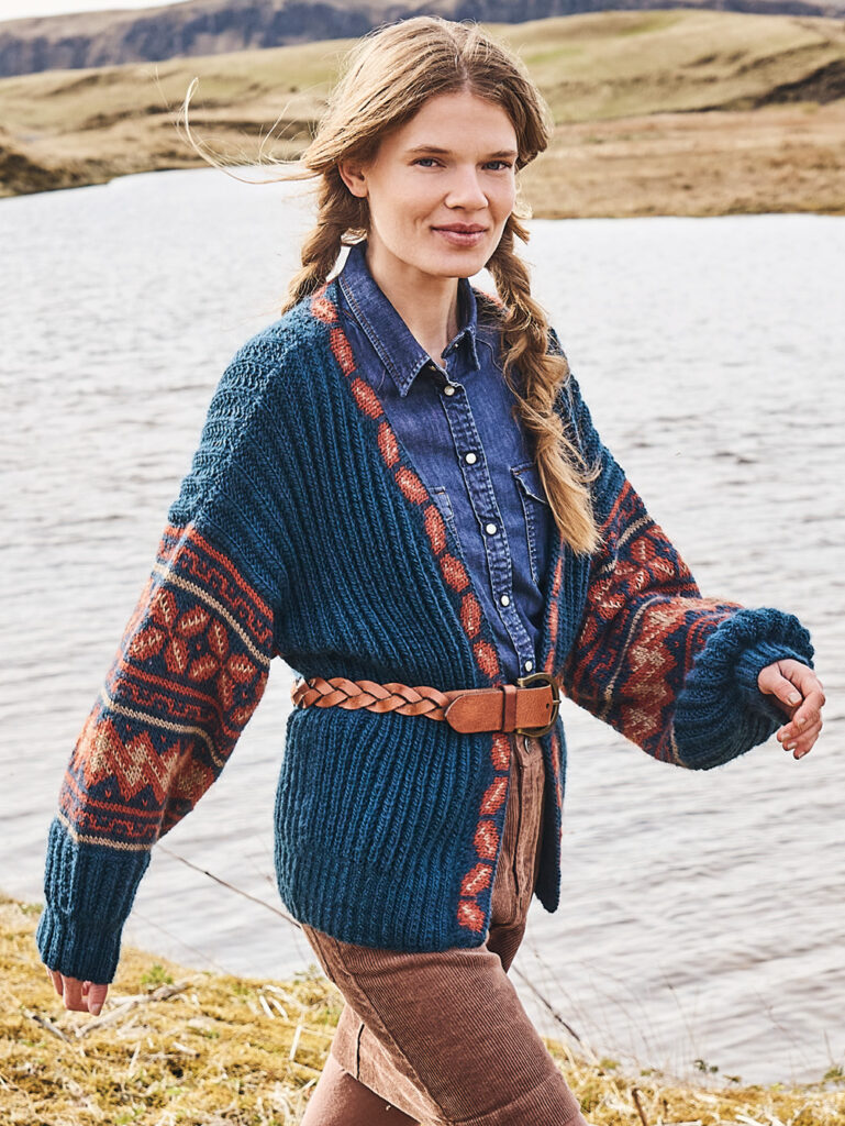 Jetzt heißt es raus aufs Land! Für einen modernen Twist sorgt dabei diese verschlusslose Jacke, bei der die spannende Einteilung verschiedener Muster begeistert. Für das Rückenteil und die Vorderteile strickst du in Petrol das «falsche» Patent. So heißt ist ein Rippenmuster, das nur aus rechten und linken Maschen besteht, aber in jeder Reihe versetzt gestrickt wird. Bei den Ärmeln wird es etwas anspruchsvoller: Hier werden zwei verschiedene Jacquardmuster in Norwegertechnik zusammengesetzt, für die es aber ein übersichtliches Zählmuster in der Anleitung gibt.