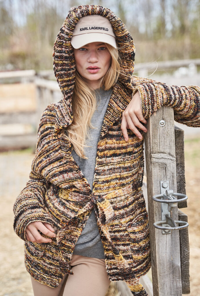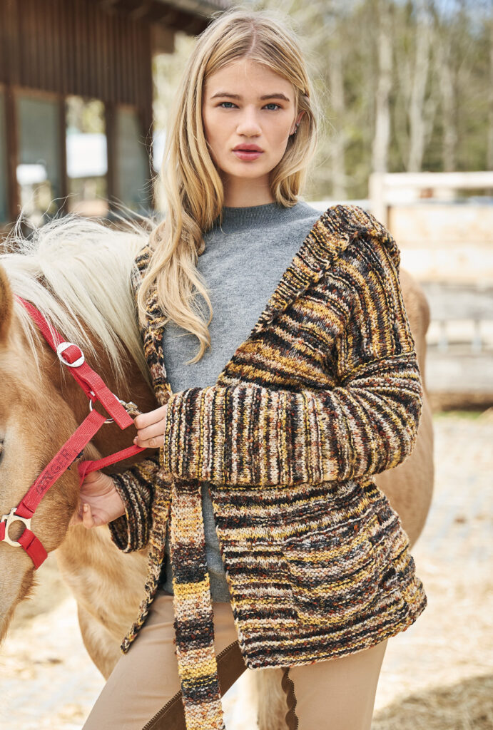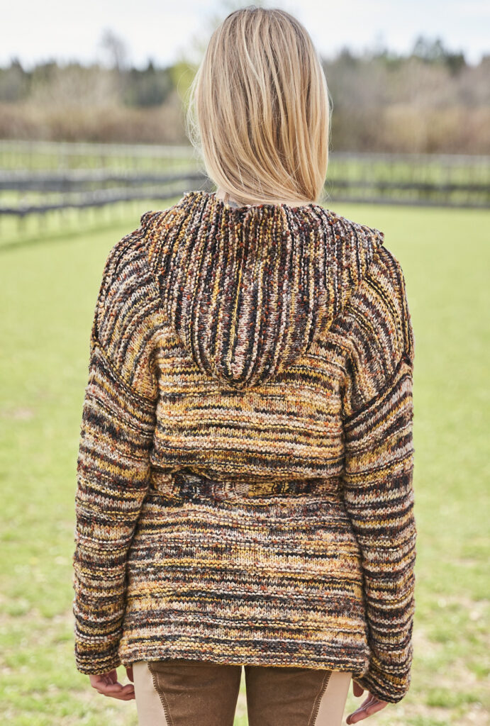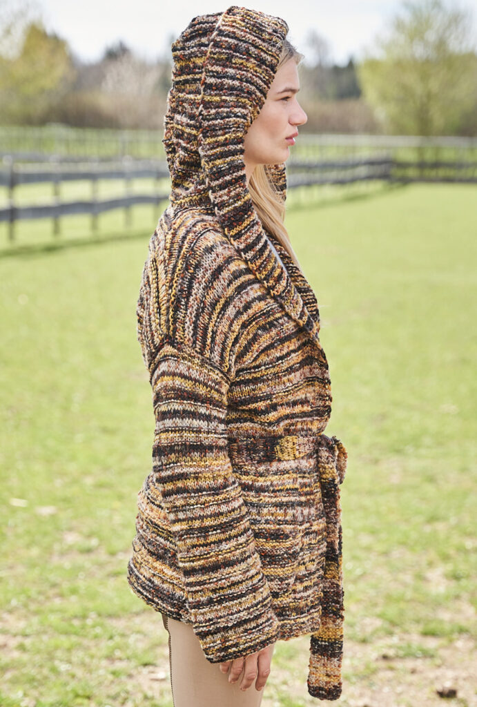Einfach im Querrippenmuster aus rechten und linken Maschen stricken, der tolle Streifeneffekt entsteht aus dem Knäuel heraus. Kapuze, Taschen und Gürtel sind die modischen Details, die der Jacke die besondere Note verleihen. Gestrickt wird in einzelnen Teilen von unten nach oben. Die Musterfolge ist nicht kompliziert und Reihe für Reihe in der Anleitung ausführlich beschrieben. Besonders praktisch: Die Kapuze wird gleich mitgestrickt! So müssen für die Fertigstellung zum Schluss nur noch alle Nähte geschlossen und die Gürtelschlaufen aufgehäkelt werden.