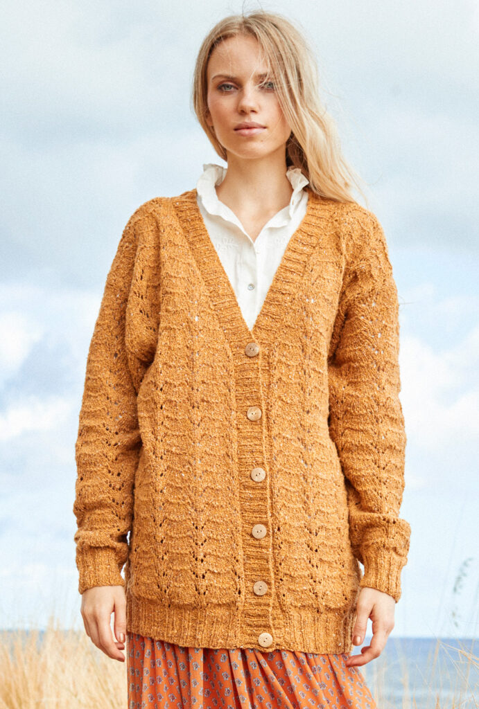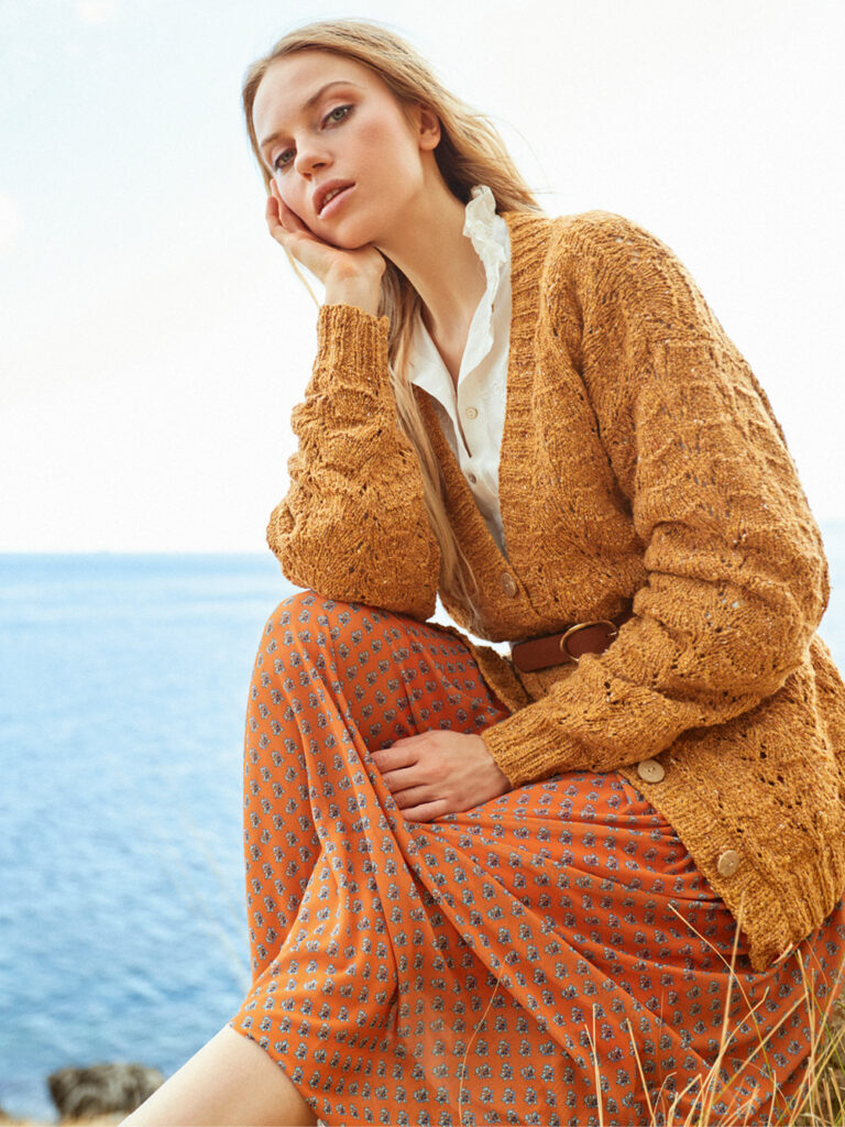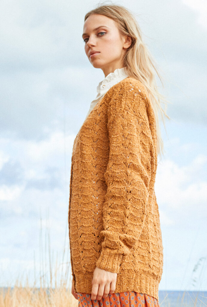 Edles Tweedgarn verleiht der ockergelben Jacke den leicht rustikalen Charakter. Mit dem hohen Anteil an Baumwolle und 25% Seide ist es zudem herrlich sommerlich und bietet einen schönen, angenehmen Fall. Im Gegensatz dazu steht das zauberhafte Wellenmuster, das für die romantische Note sorgt – ein reizvoller Kontrast! Gestrickt wird der Cardigan in Einzelteilen, jedes von unten nach oben. Direkt nach dem Rippenbündchen geht es weiter mit dem Wellenmuster. Das Muster ist nicht schwierig und die übersichtliche Strickschrift sorgt dafür, dass stets der Überblick behalten wird. Lediglich bei den Abnahmen für den V- Ausschnitt und den zunahmen bei den Ärmeln muss darauf geachtet werden, dass sich die Umschläge und zusammengestrickten Maschen in den Musterreihen ausgleichen. Sind alle Teile fertig gestrickt, werden die Nähte geschlossen und alle Verschlussränder und die Halsausschnittmaschen umhäkelt. Aus den Häkelmaschen werden dann die Maschen für die Blende herausgestrickt und diese im Rippenmuster gearbeitet.