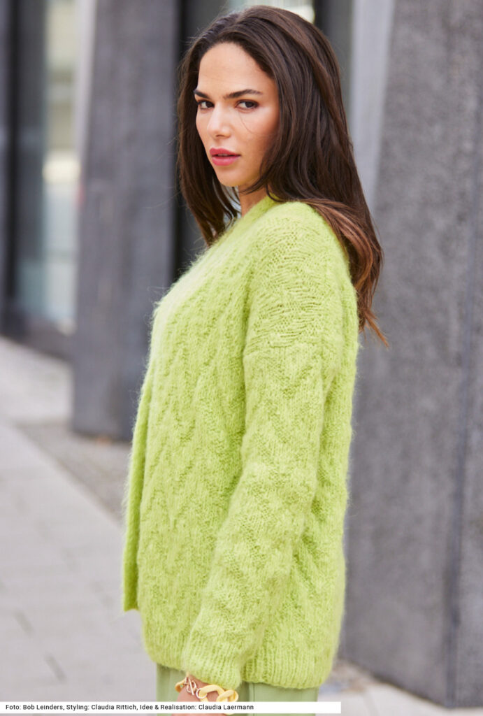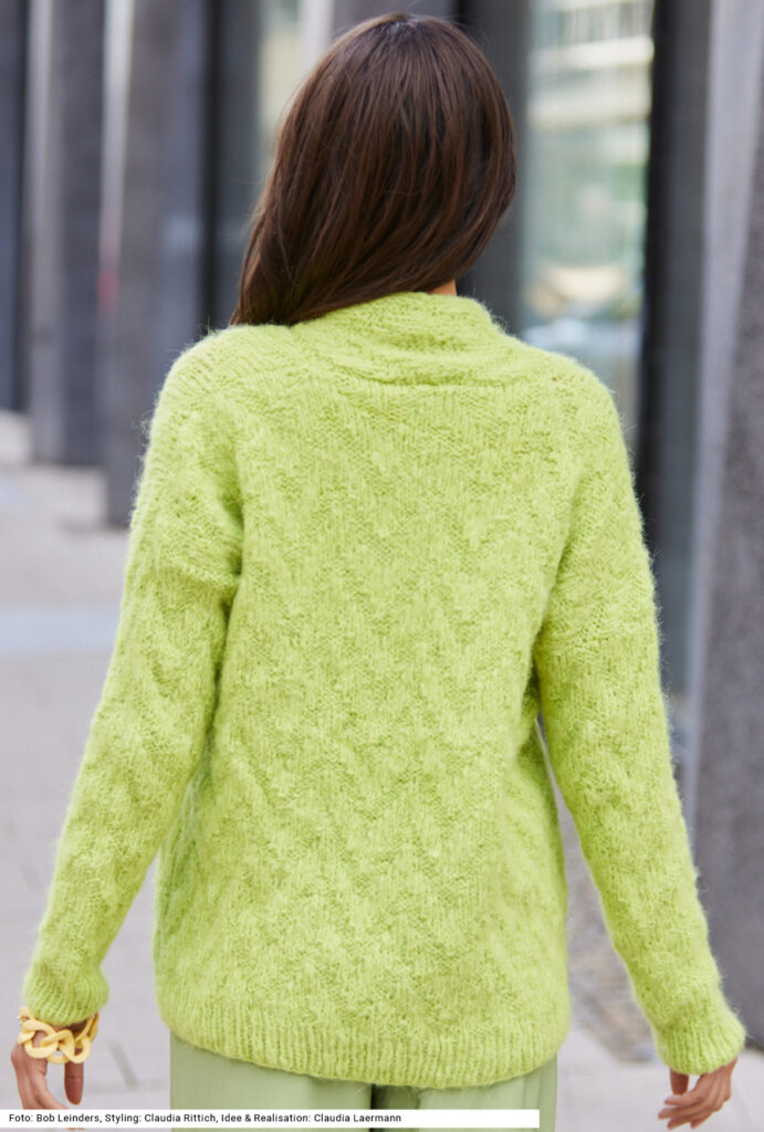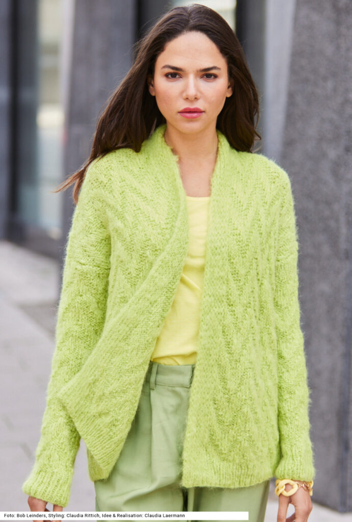 Diese leicht zu strickende, offene Jacke aus Alpaka-Schurwolle-Garn zeigt, dass es oft gar kein kompliziertes Muster oder einen superraffinierten Schnitt braucht, um modische Akzente zu setzen – hier reicht die leuchtende Farbe in hellem Grün. Die Zacken entstehen ganz einfach aus rechten und linken Maschen. Alle Bündchen sind im 1/1-Rippenmuster gearbeitet, die mitgestrickte Vorderteilblende ebenfalls, jedoch werden hier abwechselnd die Maschen abgehoben – auf diese Weise zieht sich die Blende nicht zusammen. Die Vorderteilblende läuft um den Halsausschnitt weiter. Eine Anleitung gibt es für die Größen 38/40 und 44/46.