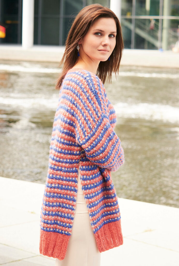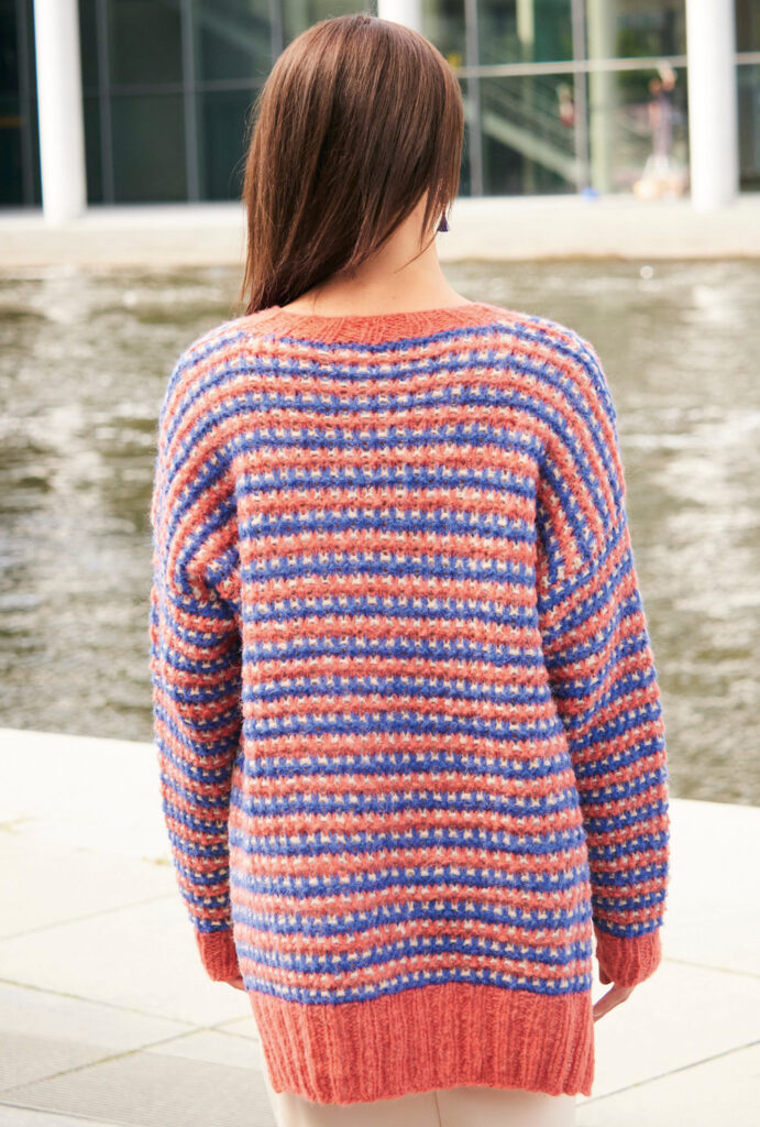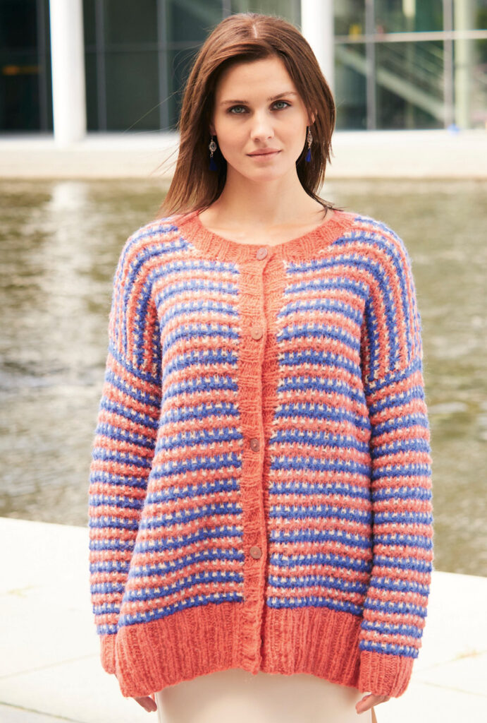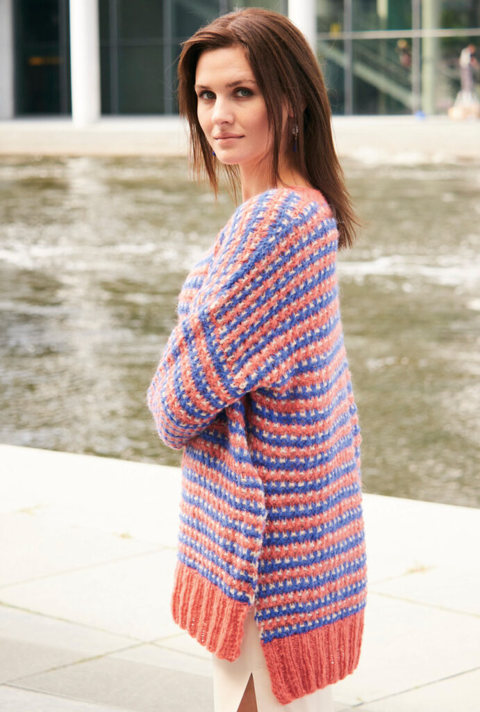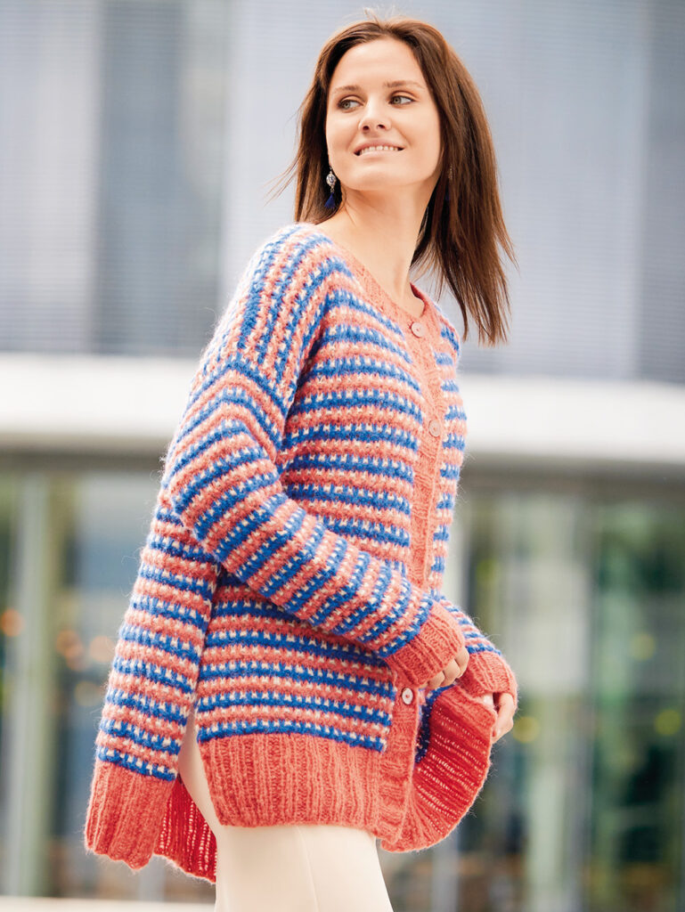 Die Jacke aus Alpaka-Schurwolle-Mischgarn besticht durch ihre sorgfältig bestimmte Kombination der Farben Koralle, Beige und Blau. Besonderer Hingucker: Die Seitennähte werden bei diesem hippen Oversize-Cardigan bis kurz vor die Armausschnitte offen gelassen. Der hohe Bund am Saum und die Ärmelbündchen, wie auch die Ausschnittblende und die Knopfleiste sind in 2/2-Rippen gearbeitet. Das übrige Muster ist ganz einfach: Alle zwei Reihen wird die Farbe gewechselt, durch hochgezogene Maschen ergibt sich ein Pünktchenstreifen in Beige. Die Anleitung dazu kannst du in Größen 38/40 und 44/46 sowie 50/52 downloaden.