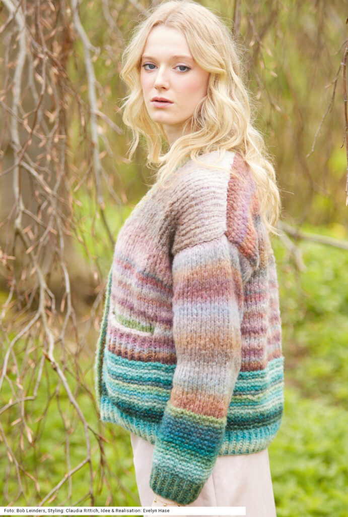 Diese Jacke mit Knopfblende zeigt, wie du drei verschiedene Farbverlaufsgarne (Beige/Braun, Grün/Blau und Pastell) kombinieren kannst, ohne ins Knallbunte abzudriften. Essenziell dabei: Keines der Garne darf eine dominante Rolle einnehmen – denn nur so entsteht ein abwechslungsreiches, aber stets harmonisches Gesamtbild, das noch dazu immer individuell ist. Vorder- und Rückenteil werden in einem Stück gearbeitet, so gibt es bei den einzelnen Teilen keine Farbdifferenzen. In den Vorderteilen ist jeweils eine Eingrifftasche eingearbeitet. Das flauschige Schurwolle-Polyamid-Garn wird mit 6er-Nadel verstrickt – da kommt man schnell voran, zumal das Muster – kraus rechts und glatt rechts einfach zu stricken ist. Die Bündchen sind 1 rechts verschränkt, 1 links gestrickt. Eine Anleitung gibts für die Größen 38/40, 42/44 und 46/48.