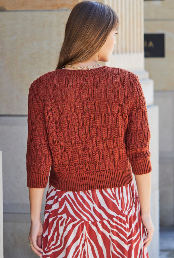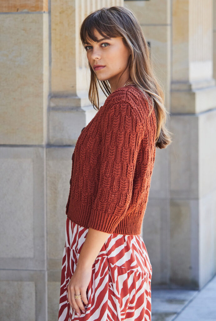 Ein tolles Zopf-Strukturmuster macht bei diesem Cardigan richtig Lust aufs Nachstricken. Der perfekte Begleiter für den Frühling besticht durch lässige Ärmel in 3/4-Länge und einen runden Ausschnitt. Die Teile werden einzeln von oben nach unten gestrickt und schließlich zusammengenäht, dabei wird die Knopfleiste gleich mitgearbeitet. Lediglich die Blende am Auschnitt wird zum Schluss angestrickt. Eine Strickschrift und der Schnitt sind die perfekten Helfer für dieses Projekt. Auch die Armkugel wird so zum Kinderspiel und sorgt für die perfekte Passform der neuen Lieblingsjacke. Die Anleitung beinhaltet die Größen 36/38, 40/42 und 44/46.