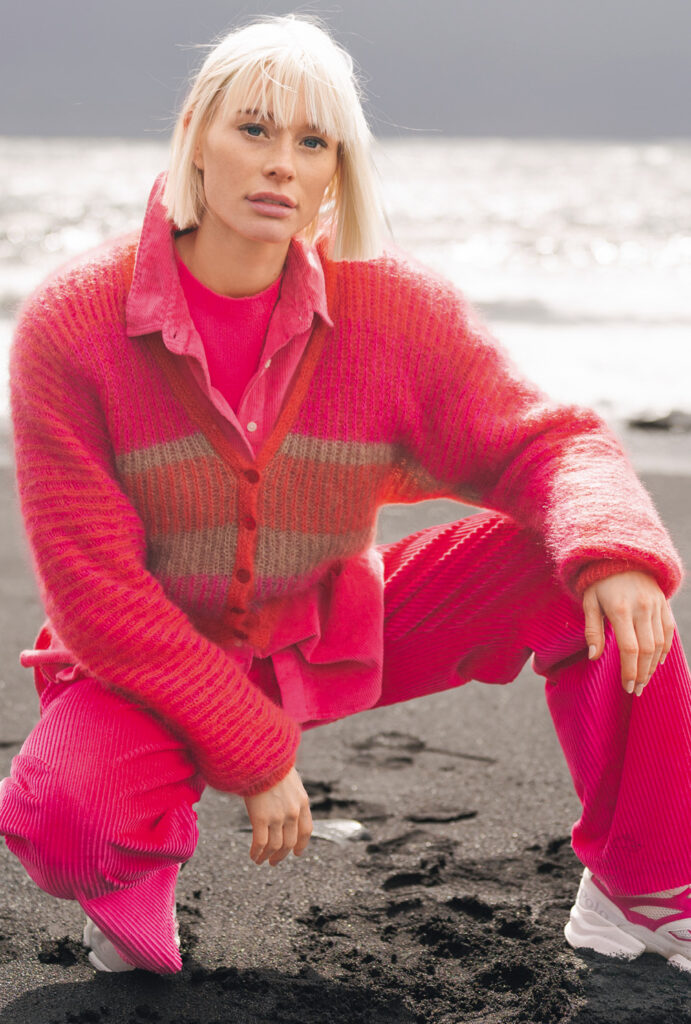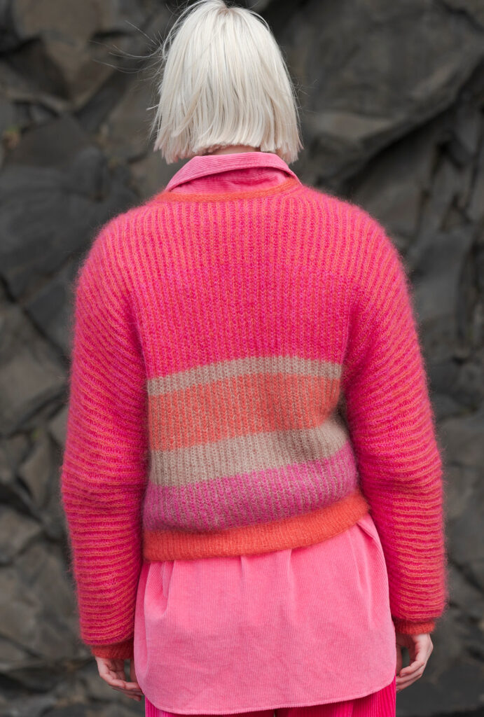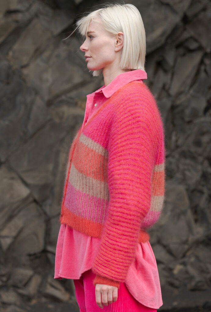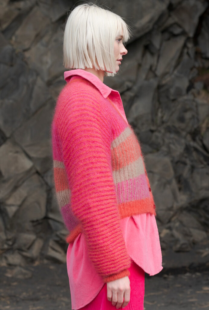 Farbe ist in dieser Saison immer noch ein wichtiger Bestandteil der Mode, sie wird aber neu gewichtet. Hier sorgen leuchtendes Rot und Pink für eine harmonische Allianz, deren Farbkraft durch neutrales Beige aber etwas reduzierter zur Geltung kommt. Das Streifendesign und der Wechsel zwischen ein- und zweifarbigem Patentmuster ist spannend und lässt eine aparte Jacke in weichem Mohairflausch entstehen. Der Clou: Sie wird über die Schultern hinweg an einem Stück gearbeitet, die Ärmel werden gleich mit angestrickt – so brauchst du nur noch die Seiten- und Ärmelnähte schließen.