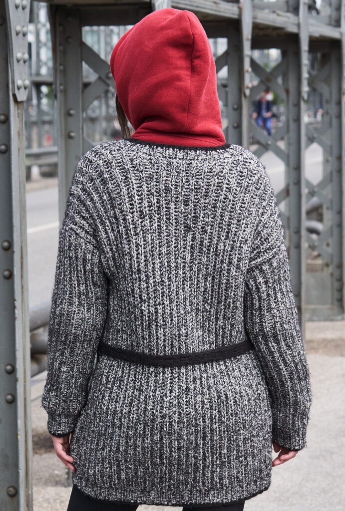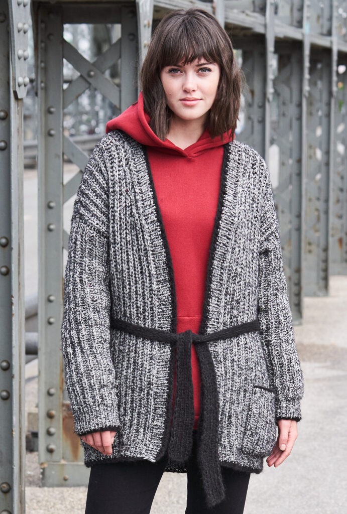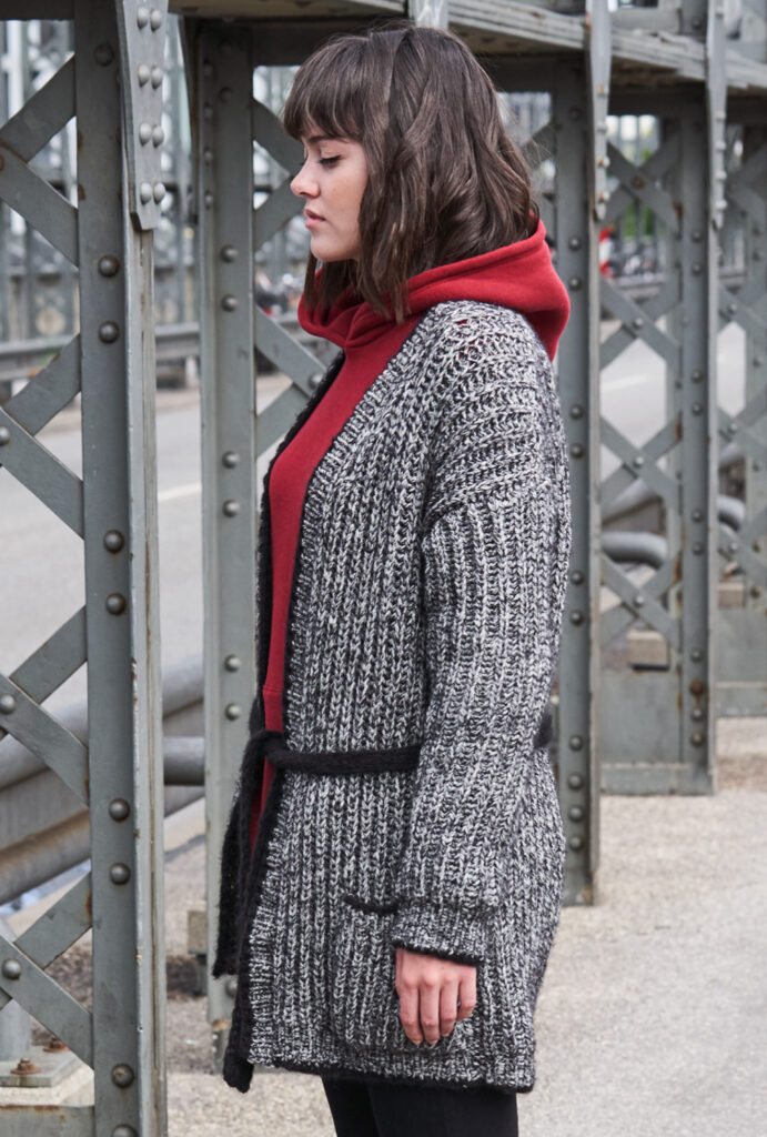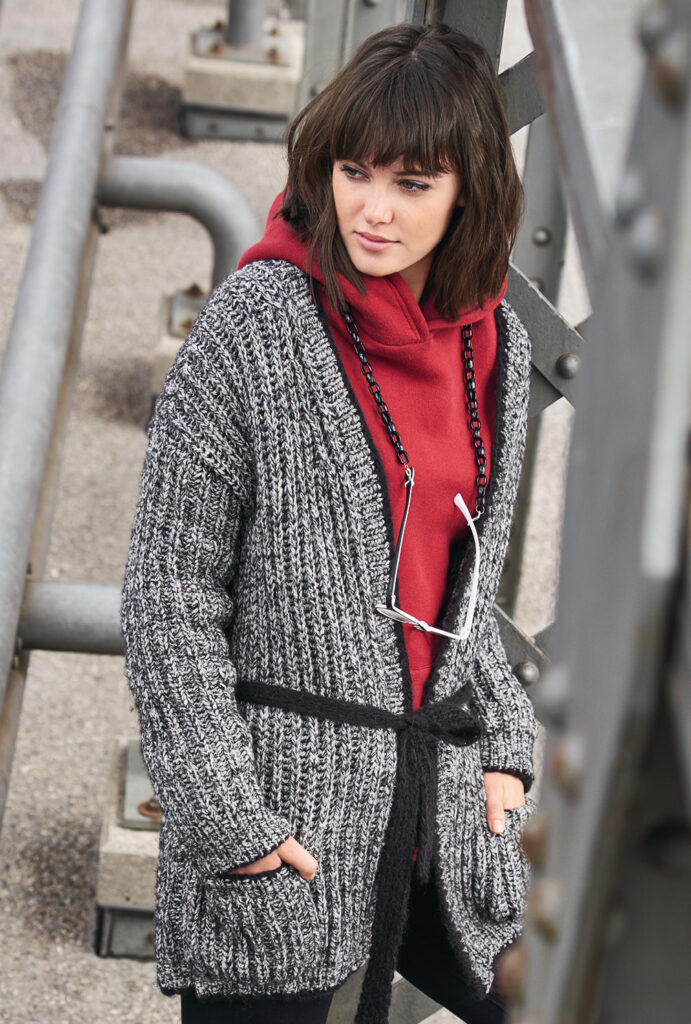 Der Cardigan in Patentrippenmuster ist ein perfektes Beispiel dafür, dass „klassisch“ alles andere als langweilig ist. Das Zusammenspiel von sportivem Garn mit Mélange-Effekt und feiner Kettenstruktur lässt das Patentmuster besonders lebendig wirken und betont die elegante Lässigkeit des Designs. Die aufgesetzten Taschen runden den rustikal angehauchten Look ab, während der Bindegürtel eine feminine Silhouette verleiht. Mit Nadelstärke 7 geht es auch im Patentmuster schnell voran – zumal sich das Garn sehr angenehm und elastisch verarbeiten lässt. Gearbeitet wird in Einzelteilen von unten nach oben: Erst das Rückenteil, dann die Vorderteile und zum Schluss die Ärmel. Sind alle Teile fertig, werden noch die Taschen und der Bindegürtel gestrickt. Dann noch die Taschen aufnähen, alle Nähte schließen und aus den Ausschnitträndern und vorderen Kanten die Maschen für die Blende herausstricken. Die schwarzen Blenden im Rippenmuster geben dem Mélange Garn einen schönen Rahmen und sorgen zudem für eine schöne Form. Auf Taillenhöhe werden dann Gürtelschlaufen aus Luftmaschenketten eingearbeitet, damit auch der Bindegürtel stets an seinem Platz bleibt.
