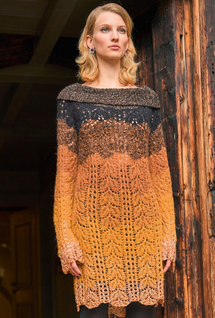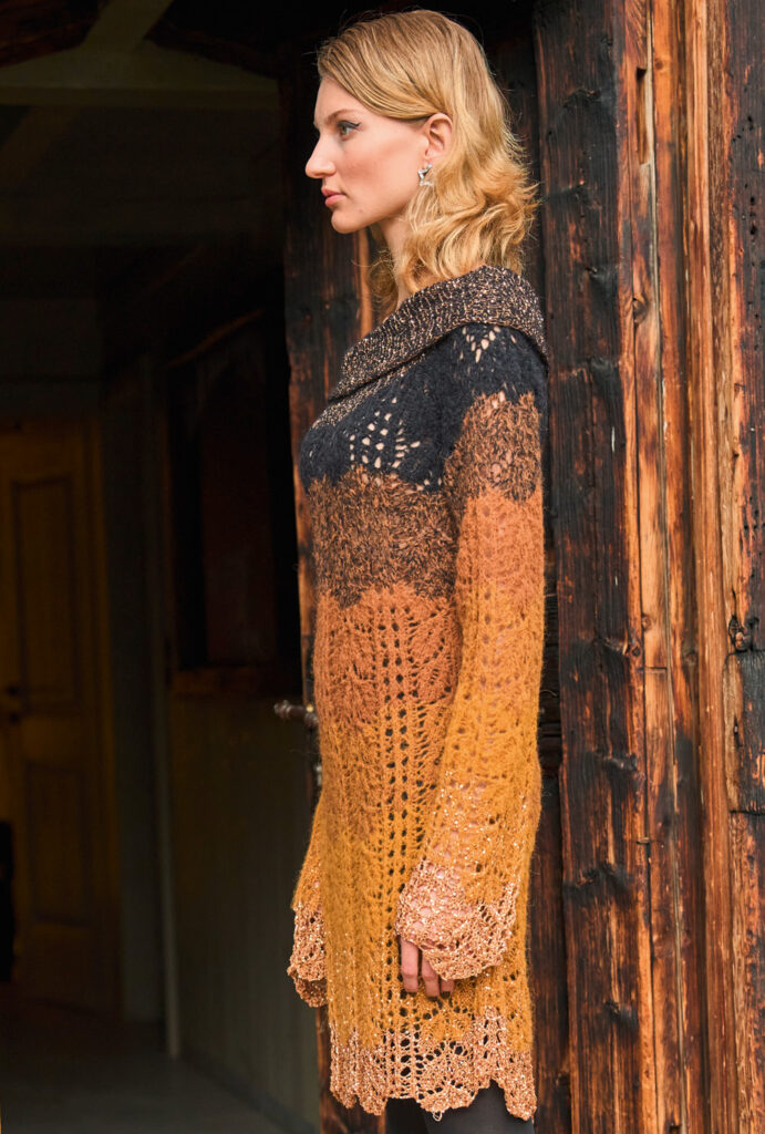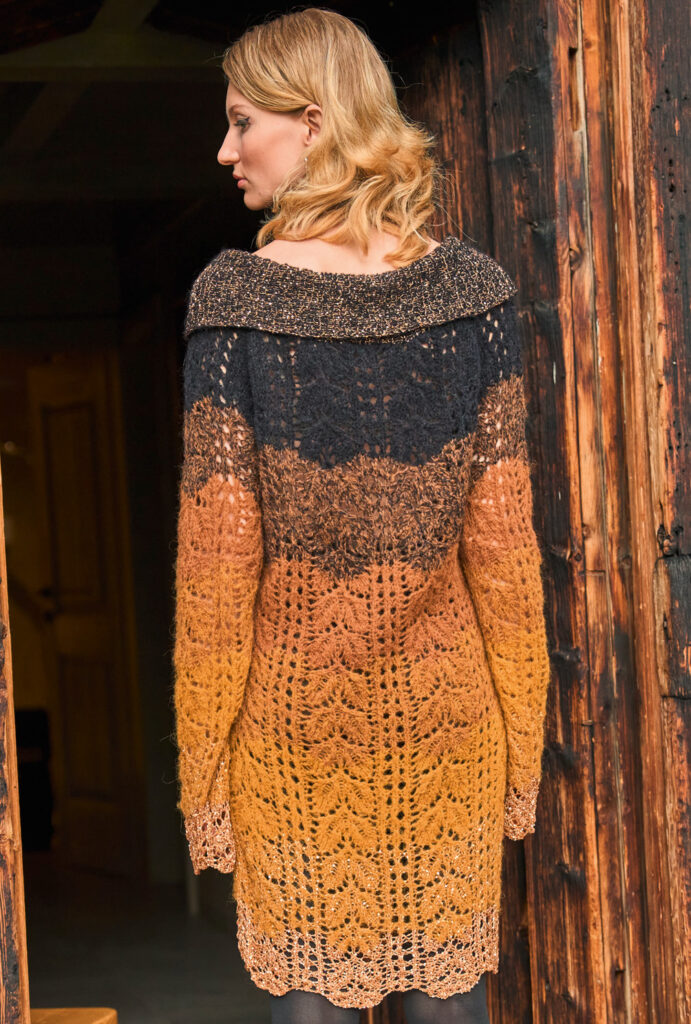 Der spannende Farbverlauf von Gold über Braun bis hin zu Schwarz entsteht bei diesem attraktiven Kleid durch doppelfädiges Stricken, bei dem immer zwei unterschiedliche Nuancen zusammen verarbeitet und mit glitzernden Pailletteneffekten kombiniert werden. Da musst du ein bisschen aufpassen, aber wir haben es in unserer Anleitung genau beschrieben. Gleichzeitig strickst du das filigrane Ajourmuster, für das wir eine genaue Strickschrift erstellt haben. Es sorgt dafür, dass beim Farbwechsel die leichte Bogenform entsteht.