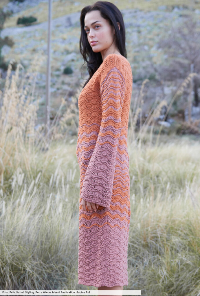 Der sanfte Farbverlauf von Rotbraun nach Rost ist hier mehr als gelungen. Dafür wird in unterschiedlicher Intensität streifenweise mit den Farben gespielt. Das Wellenmuster, für das wir in der Anleitung eine genaue Beschreibung anbieten, unterstreicht diesen Effekt. Aus unkompliziertem Ganzjahresgarn ein tolles Strickkleid mit modischen Trompetenärmeln, die durch den Einsatz verschiedener Nadelstärken entstehen. Weiteres Plus: Du brauchst keine Blenden oder Bündchen, darauf haben wir – auch beim Halsausschnitt – komplett verzichtet.