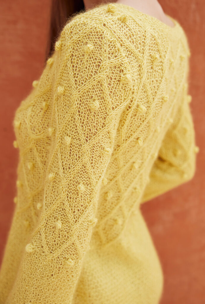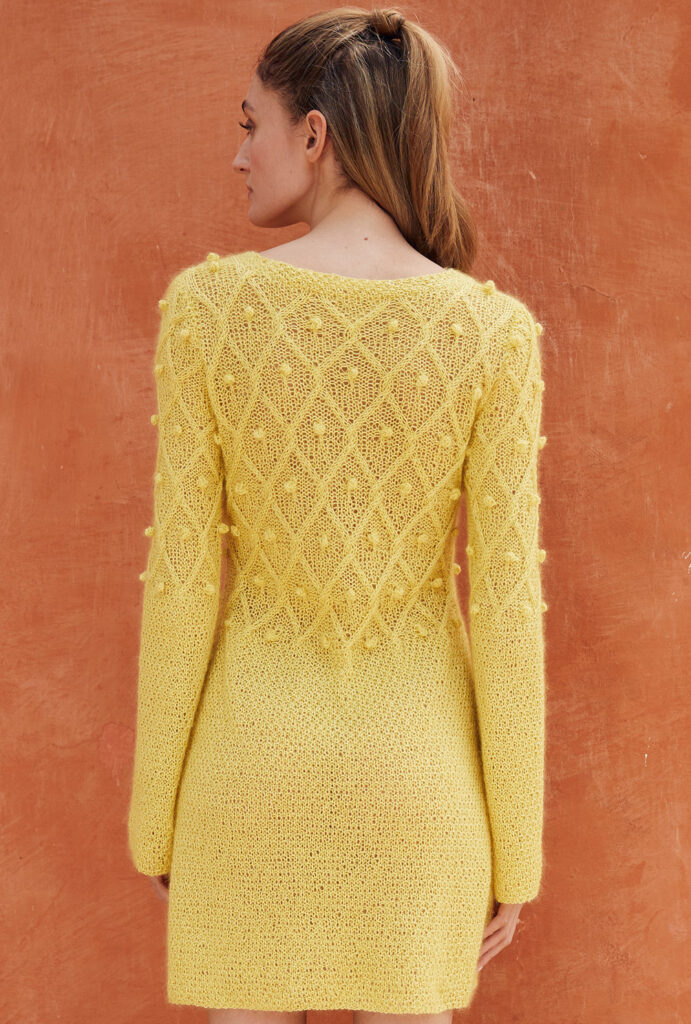 Better together: Zwei Garne zusammen zu verstricken hat seinen ganz besonderen Reiz. Hier ist es eine Kombination aus feinem Leinengarn und edler Mohairseide, die bei diesem leicht ausgestellten Kleid für den Schmeichelfaktor in Sachen Komfort sorgen. Und auch die Muster setzen sich ins richtige Licht: Wir beginnen mit einfachen Perlstrukturen und wechseln im oberen Bereich auf Rautenlinien, die wir mit Noppen effektvoll ergänzt haben. In hellen Gelbtönen ein strahlendes Statement für den Frühling!