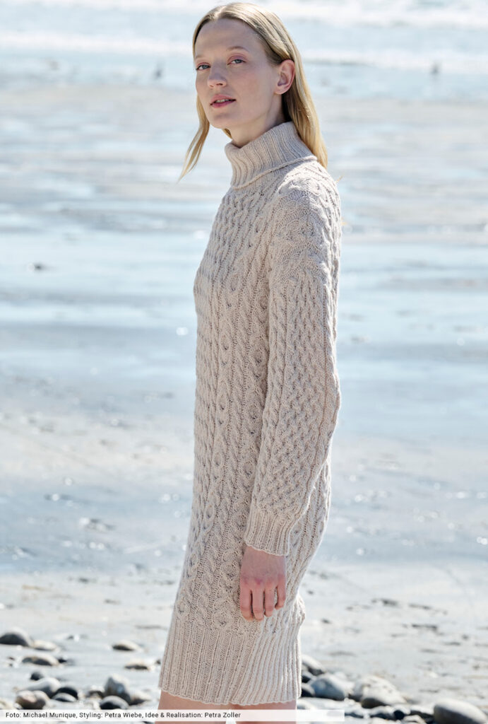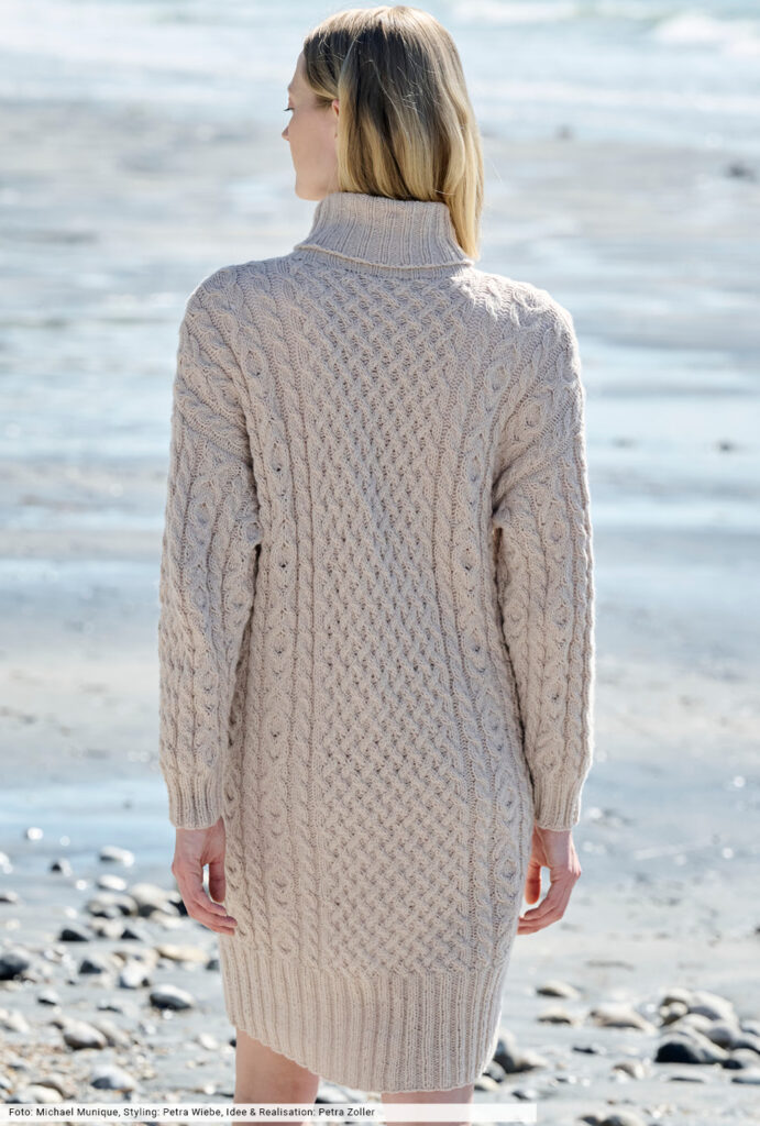 Klassisch und clean, so könnte man den Look dieses aparten Strickkleides aus edler Lammwolle bezeichnen. Das gilt aber nur für die Silhouette und die neutrale Cremenuance. Dafür kann man sich voll und ganz auf die Muster konzentrieren: in der Mitte plastische Webstrukturen, beidseitig davon schmale und breitere Zopfstreifen im Wechsel. Dafür gibt es übersichtliche Strickschriften, die dir die Arbeit erleichtern. Breite Rippenbündchen und der Rollkragen bilden das Finish.