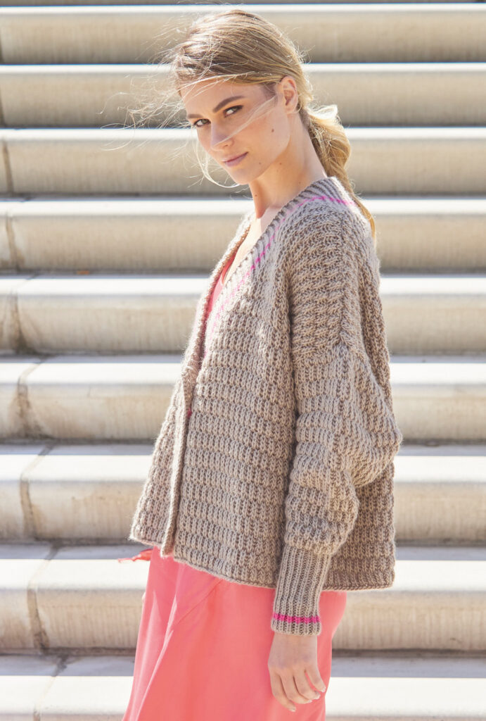 Weit geschnitten, mit überkreuzten Vorderteilen, – so stellen wir uns bequeme Jacken, die zu allem passen, vor. Diese hat ein Muster aus versetzten Patentmusterstreifen und Halbpatent-Bündchen an den Ärmeln sowie an der breiten Ausschnittblende. Bündchen und Blende bekommen noch einen kontrastfarbigen schmalen Streifen in Pink. Geschlossen wird die Jacke aus Schurwolle-Mischgarn mit einem sichtbaren großen Knopf, ein versteckter Magnetknopf hält die weit übereinander liegenden Vorderteile an der richtigen Stelle. Die Anleitung steht für die Größen 36 – 40 und 42 – 46 zur Verfügung.
