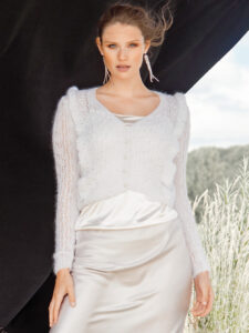 Dieses kurze Jäckchen ist aus einem Mischgarn (Mohair, Schurwolle, Seide und Synthetik) gestrickt, in dem die Pailletten gleich eingearbeitet sind. Die Rüschenblenden an den Seiten und die zwei verschiedenen Ajourmuster unterstreichen die Luftigkeit und Romantik des Looks. Ein herzförmig verlaufender V-Ausschnitt passt perfekt zum gesamten Style, wie auch die kleinen, runden Perlmuttknöpfe. An den Seiten, quasi zwischen den Rüschenvolants, ist die Jacke ganz einfach glatt rechts gearbeitet. Eine Anleitung steht für die Größen 36/38, 40/42 und 44/46 zum Download bereit.