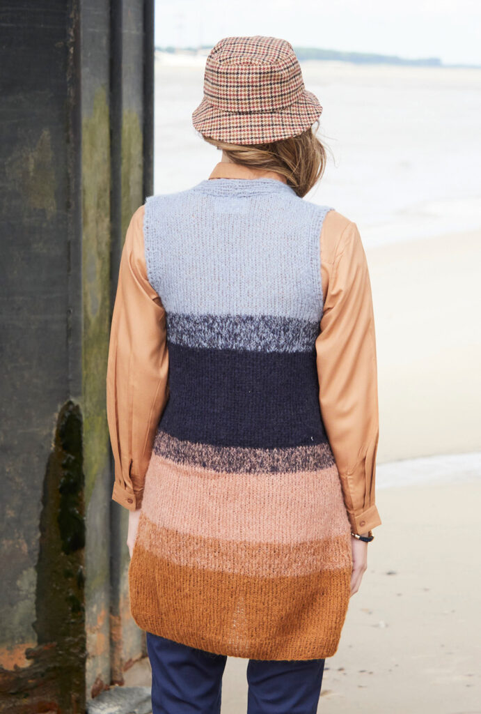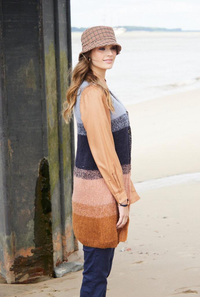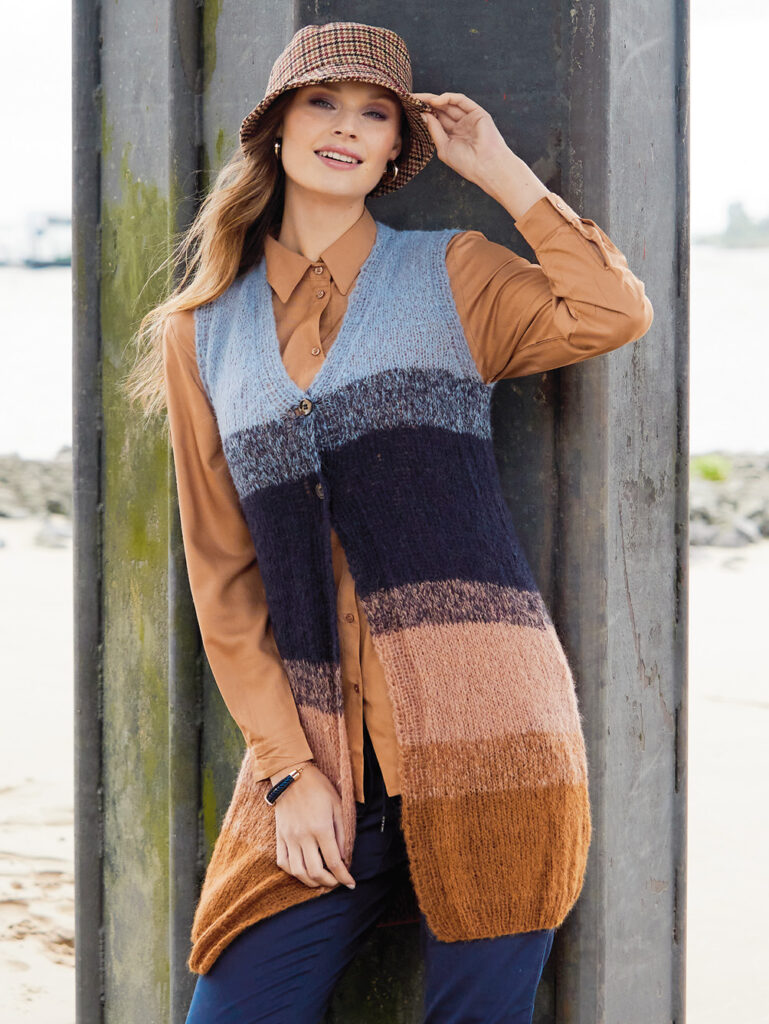 Diese lange, nach oben hin schmaler werdende Weste passt sich jedem Look an – hübsch zur Bluse, lässig-cool zum Rolli mit engen Jeans. Zudem ist sie federleicht durch das Schurwolle-Alpaka-Mischgarn und lässt etwaige Pölsterchen um die Hüfte dezent verschwinden. Die ganze Weste wird doppelfädig mit 5er Nadeln gearbeitet und an den Übergängen von einer Farbe zur anderen mit jeweils einem Faden beider Farben, sodass ein Melangeeffekt entsteht. Es braucht lediglich zwei Knöpfe, um die Weste in Brusthöhe zu schließen. Die Anleitung gibt es für die Größen 36 – 40 und 42 – 46 sowie 48/50.