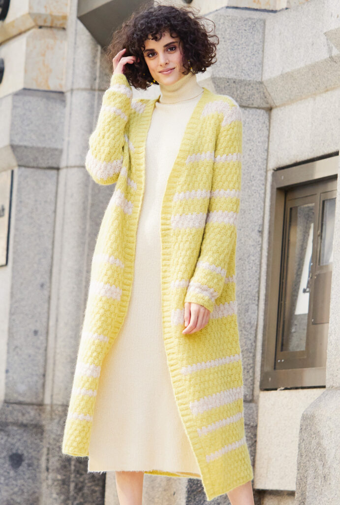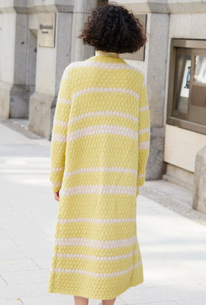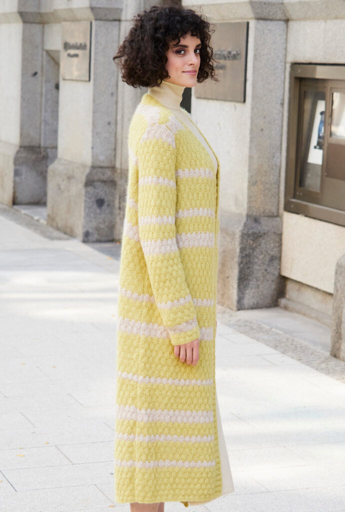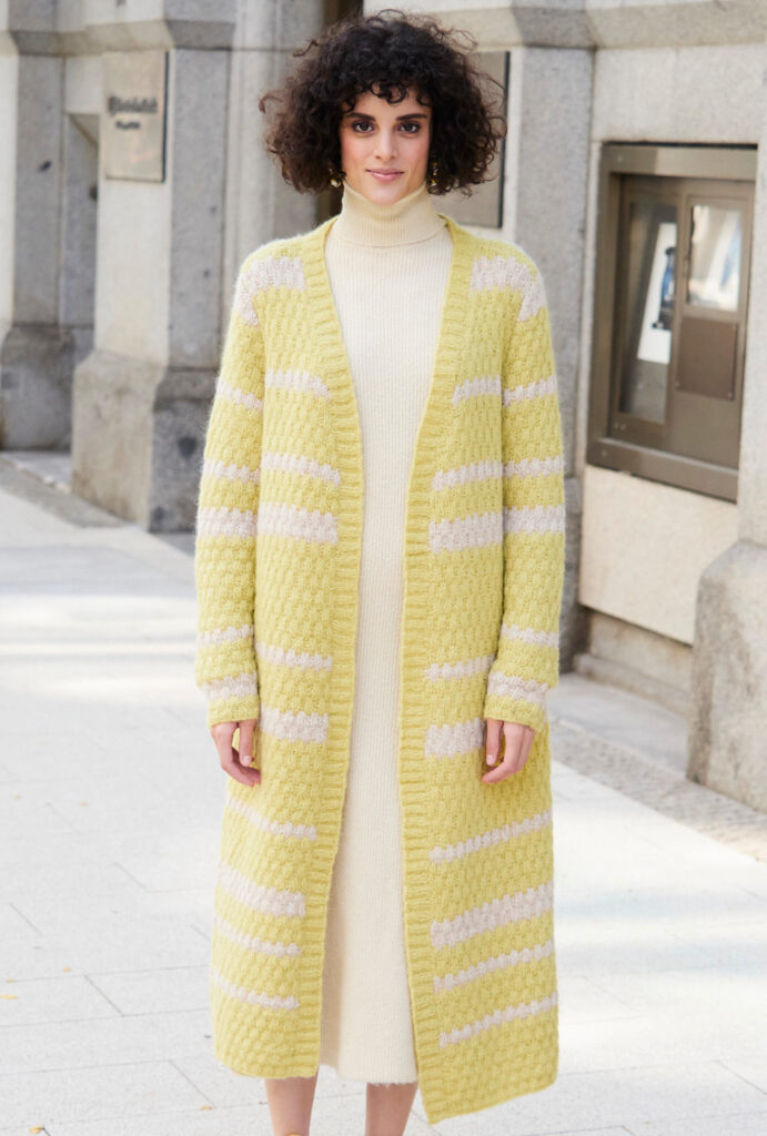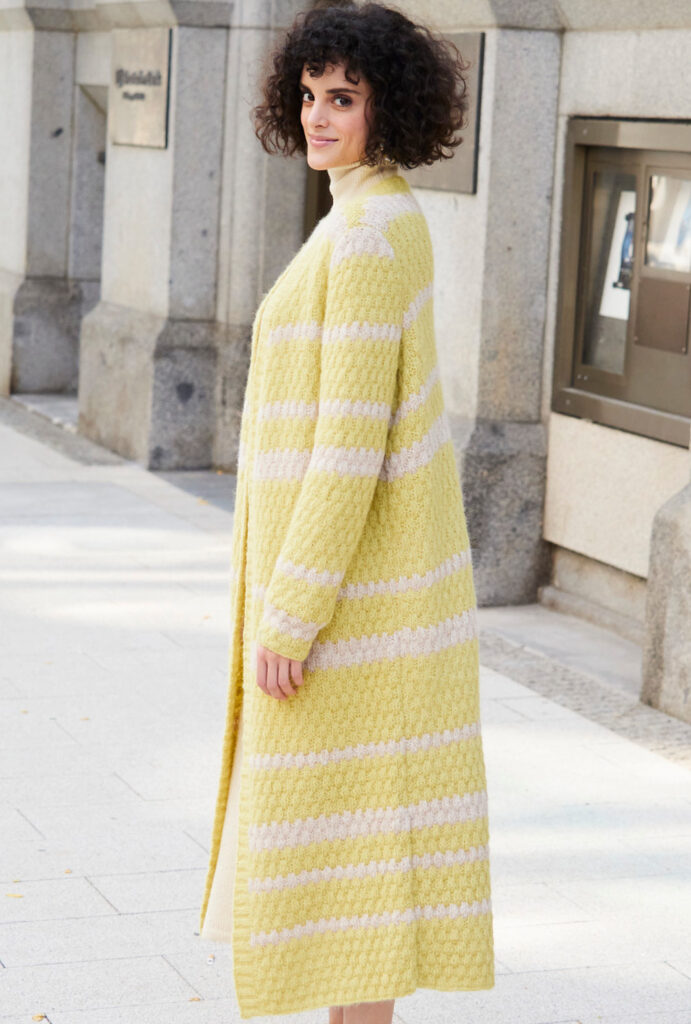 Hier kommt ein echter Hingucker. Dieser tolle Mantel wird in Einzelteilen von unten nach oben gestrickt und später zusammengenäht. Das eindrucksvolle Strukturmuster und die schmalen Streifen sind nicht zu auffällig für dieses warme Strickstück. Die gerade Passform mit Armkugel sorgen für fantastischen Tragekomfort. Der verschlusslose Mantel kann so zu vielen Gelegenheiten getragen werden. Die Anleitung enthält einen übersichtliche und leicht nachzustrickende Strickschrift,einen detaillierten Schnitt und eine ausführliche Beschreibung. So steht diesem Projekt nichts mehr im Wege. Der Pullover kann ich den Größen 36/38, 40/42 und 46/48 nachgearbeitet werden und die tolle Wolle gibt es bei LANGYARNS.