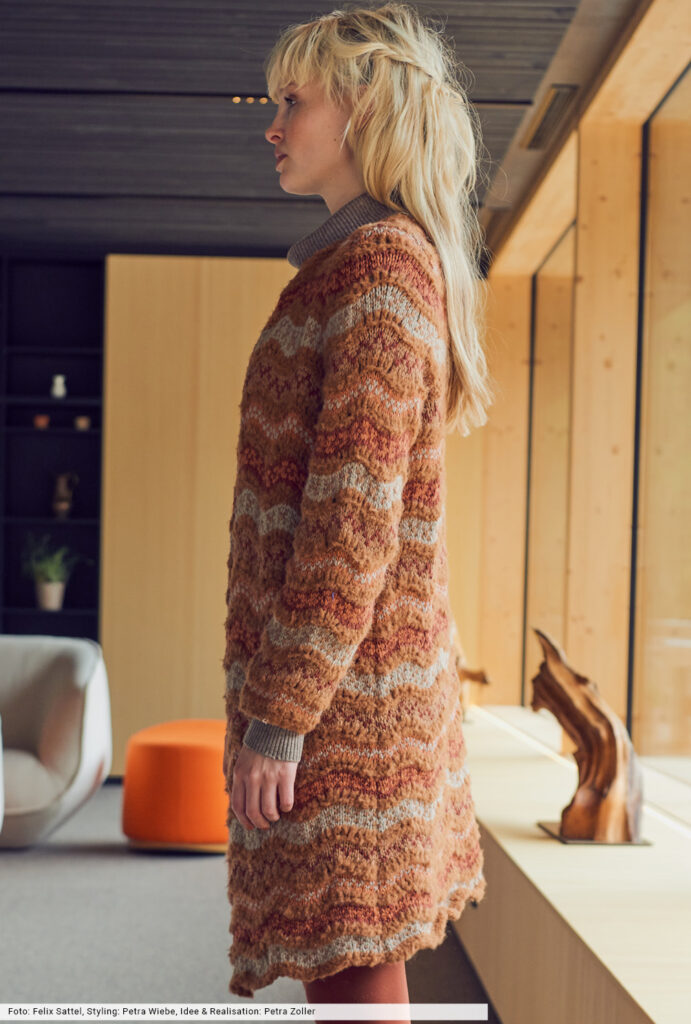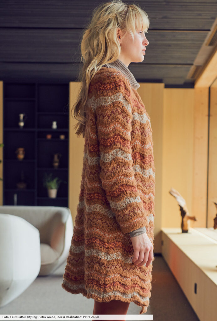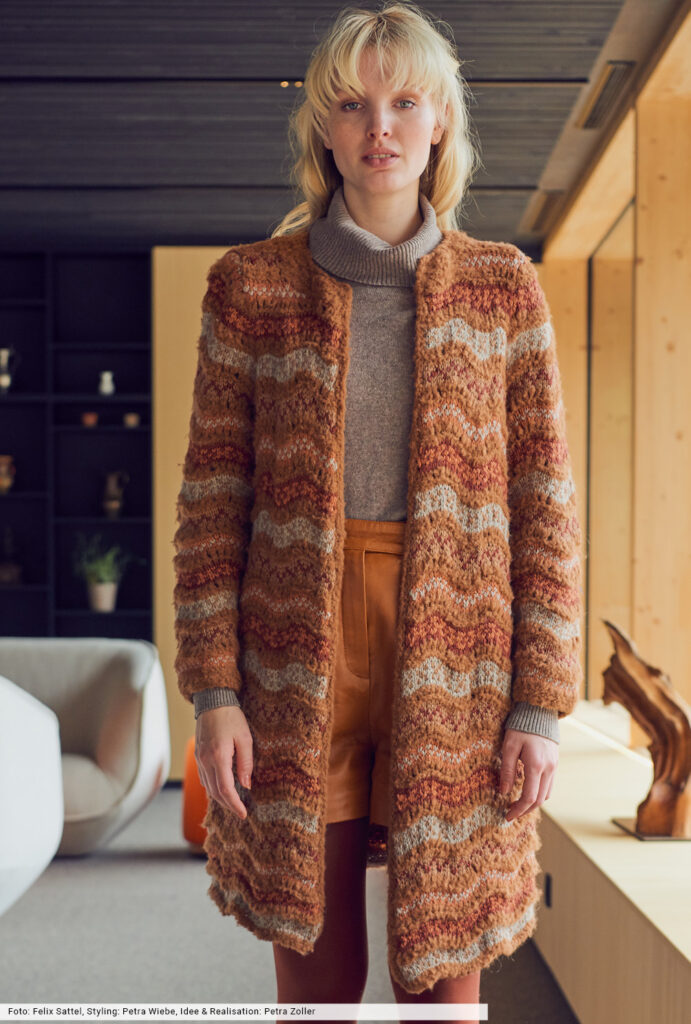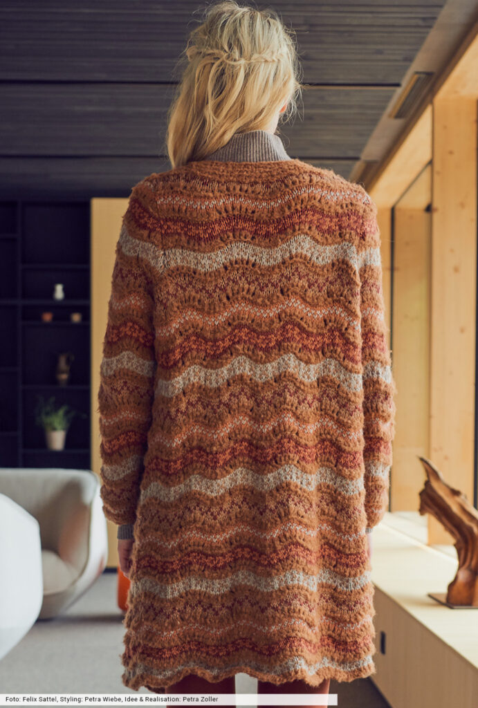 Stück für Stück wächst hier eine bezaubernde Longjacke, die es nicht von der Stange zu kaufen gibt. Das liegt an den raffinierten Wellenstrukturen, die aus unterschiedlichen Minijacquards in warmen Erdfarben entstehen und durch schmale Streifen aus flauschigem Effektgarn voneinander abgesetzt werden. Dafür haben wir in der Anleitung eine übersichtliche Strickschrift erstellt, bei der die weißen Kästchen die Wellenpartien darstellen und die farbigen Kästchen die Jacquardmusterstreifen.