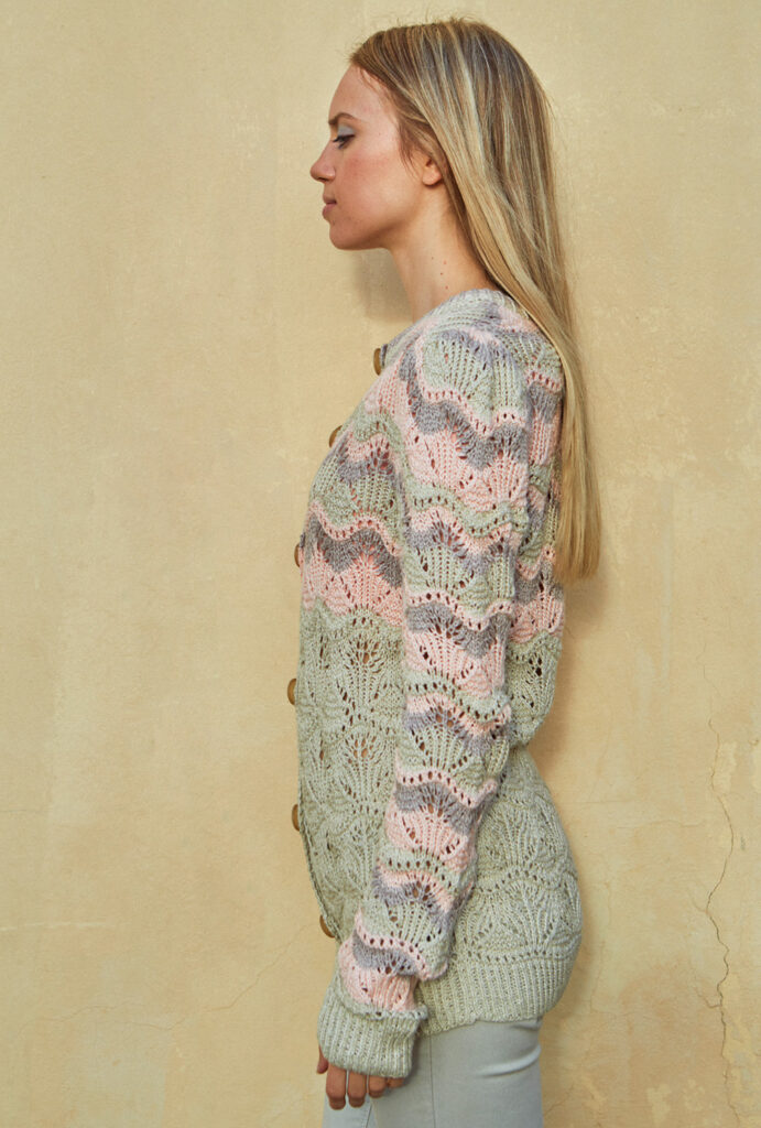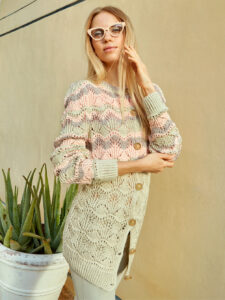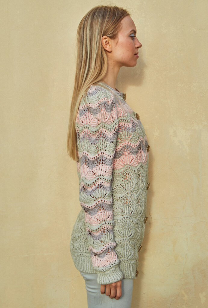 Fantasievolle Ajourmuster sind das eine, harmonische Streifendesigns das andere. Wenn beide sich zusammentun, entsteht eine Optik, die uns mit verführerischem Charme umfängt. Schönstes Beispiel: Diese Longjacke in zarten Muscheltönen. Das weiche, anschmiegsame Mischgarn sorgt zusätzlich für eine angenehme, fließende Silhouette. Gestrickt wird der sommerliche Cardigan in Einzelteilen von unten nach oben. Nach dem Rippenbündchen geht es für das Rückenteil allover im Ajourmuster weiter. Das Muster benötigt schon etwas Aufmerksamkeit, aber die übersichtliche, klare Strickschrift hilft dabei, stets den Überblick zu behalten. Lediglich bei den Ab- und Zunahmen muss darauf geachtet werden, dass sich die Umschläge und zusammengestrickten Maschen immer ausgleichen. Bei den Vorderteilen wird zusätzlich zum Lacemuster die Rippenblende gleich mitgestrickt – das sieht schön aus und ist auch noch praktisch. So müssen zum Schluss nur noch die Nähte geschlossen und die Blende für den Halsausschnitt gestrickt werden. Am besten nimmt die fertige Jacke jetzt noch ein kleines Bad und wird im Liegen getrocknet. Dabei schön in Form bringen und glattstreichen – so öffnet sich das Lacemuster und entfaltet seine ganze Pracht.