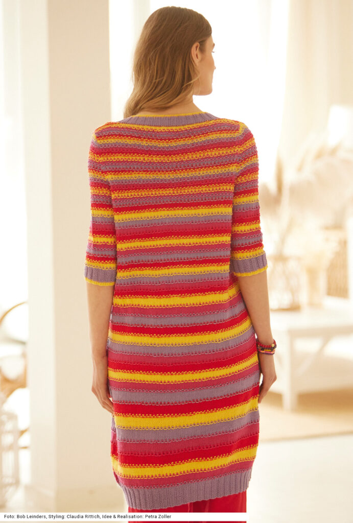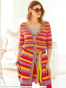 Dieser Mantel mit ellenbogenlangen Ärmeln ersetzt gut und gerne einen Pulli. Die ausdrucksstarken Farben Lila, Gelb, Magenta und Rot, die durch zwei Hebemaschenreihen miteinander verwoben werden, geben dem Look sein strahlendes Aussehen. Wer die Taille betonen mag, nutzt den zweifarbig gestrickten Bindegürtel. Die Ärmel mit Armkugel passen sich gut an die Schultern an. Der Rippenbund ganz in Lila und die Rippenbündchen an den Ärmeln und der Blende mit einem schmalen gelben Streifen zusätzlich zu Lila fassen das Gestrick wunderschön ein. Gearbeitet wird mit Baumwolle-Viskose-Garn. Eine Anleitung gibt es für die Größen 36/38, 40/42 und 44/46.
